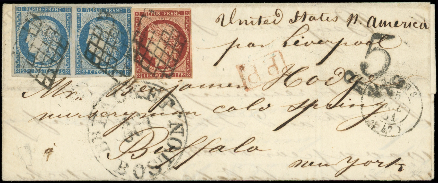 4 et 6, 25c. bleu PAIRE et 1f. carmin, obl. GRILLE s. LAC, càd PARIS 15/10/51, passage BOSTON, TAXE 5 cents pour BUFFALO, TTB