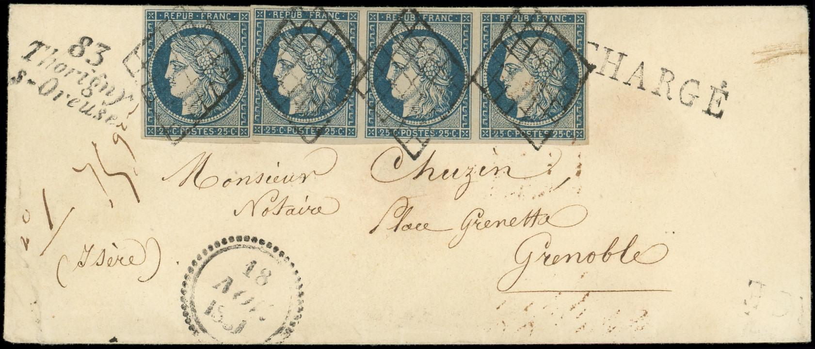 4 25c. bleu, BANDE de 3 + 1 ex. obl. GRILLE s. Env. CHARGE, Cursive 83/THORIGNY/S-OREUSE et Dateur B 18/11/51, RR et Superbe