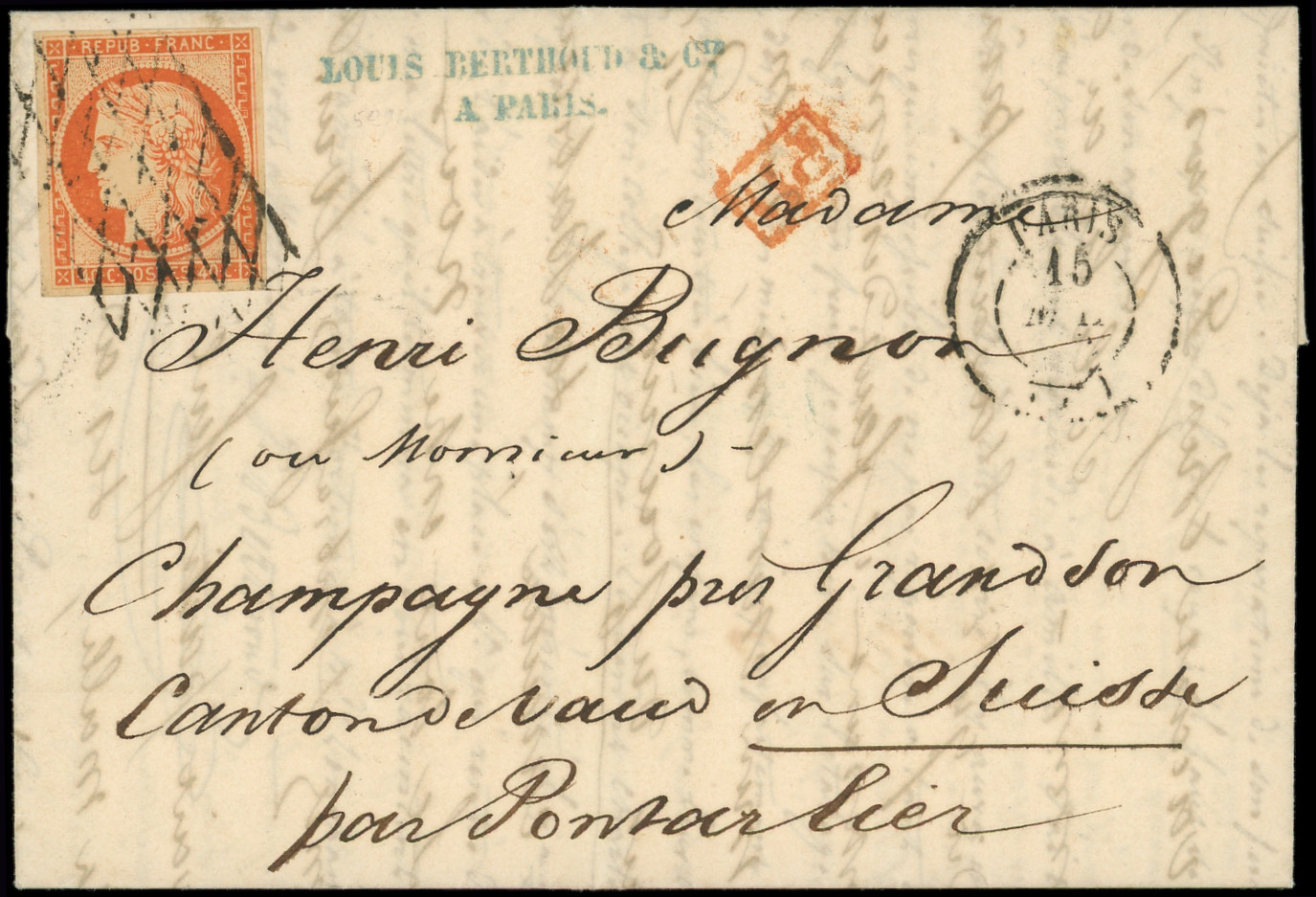 5 40c. orange, obl. GRILLE SANS FIN s. LAC, càd PARIS 15/5/52, arr. GRANDSON Suisse 17/5, TTB
