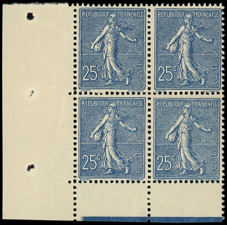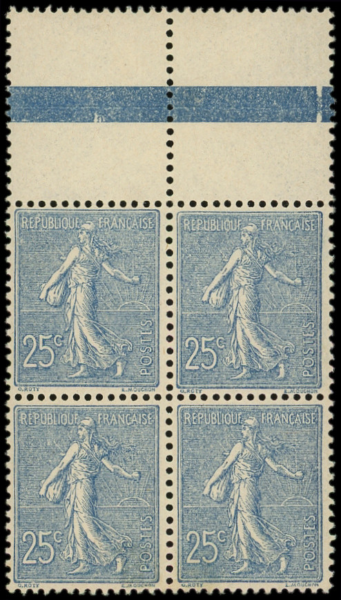 132 Semeuse Lignée, 25c. bleu, BLOC de 4 bdf, très bien centré, TTB