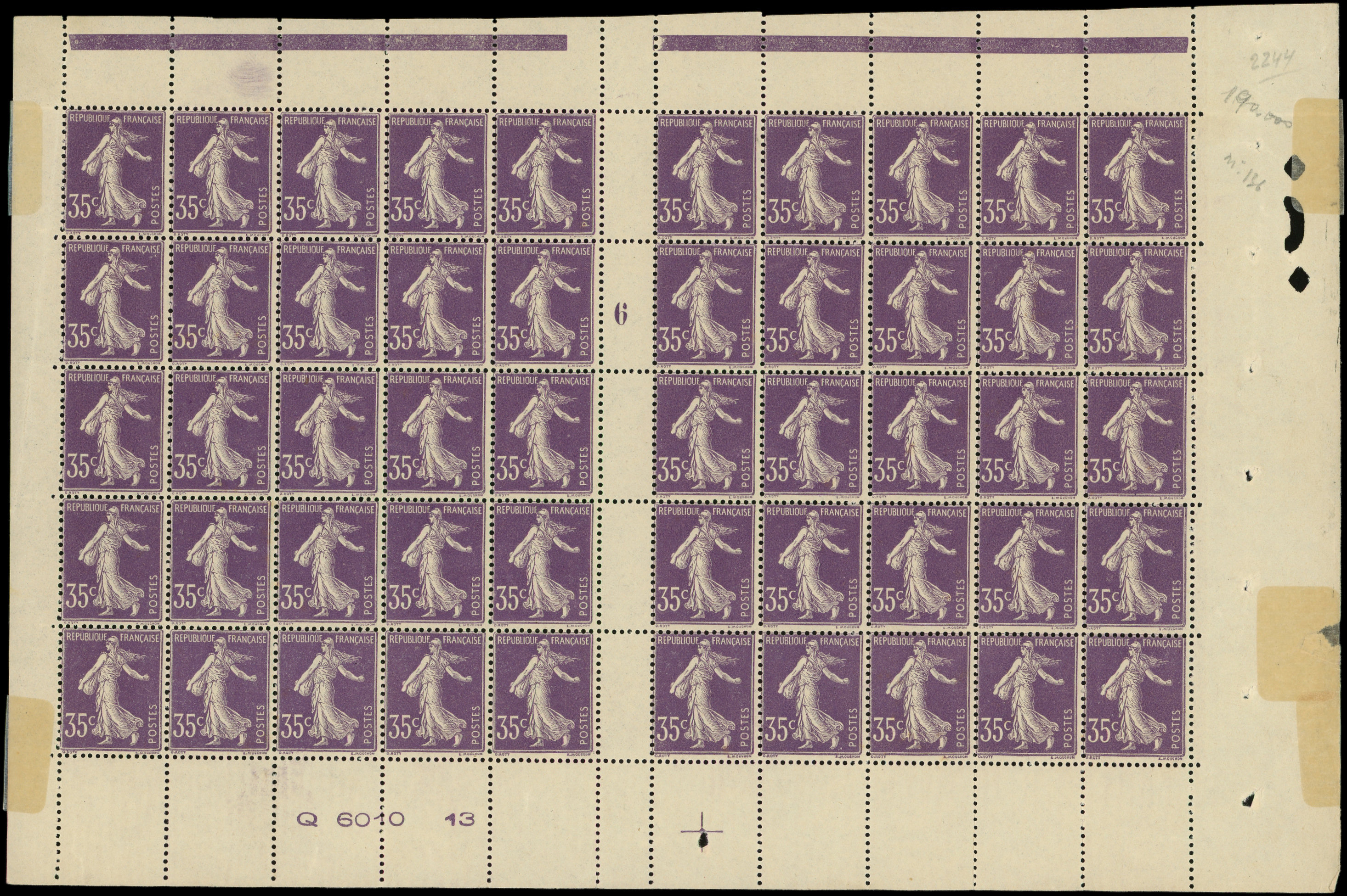 136 Semeuse Chiffres Maigres, 35c. violet T IIA, PANNEAU de 50 bas de feuille, bon centrage d'ensemble, TB