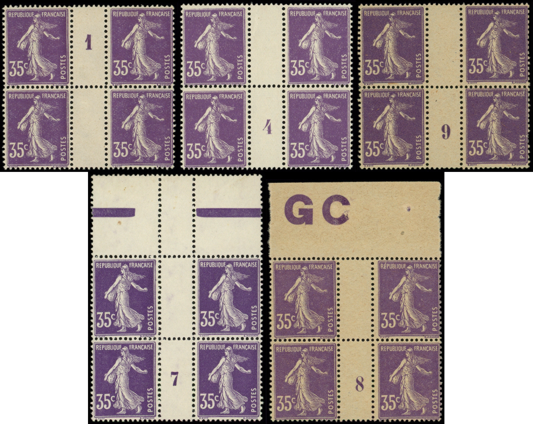 142 Semeuse Camée, 35c. violet, 5 BLOCS de 4 Mill.1, 4, 7, 8 et 9, ces 2 derniers GC, TB