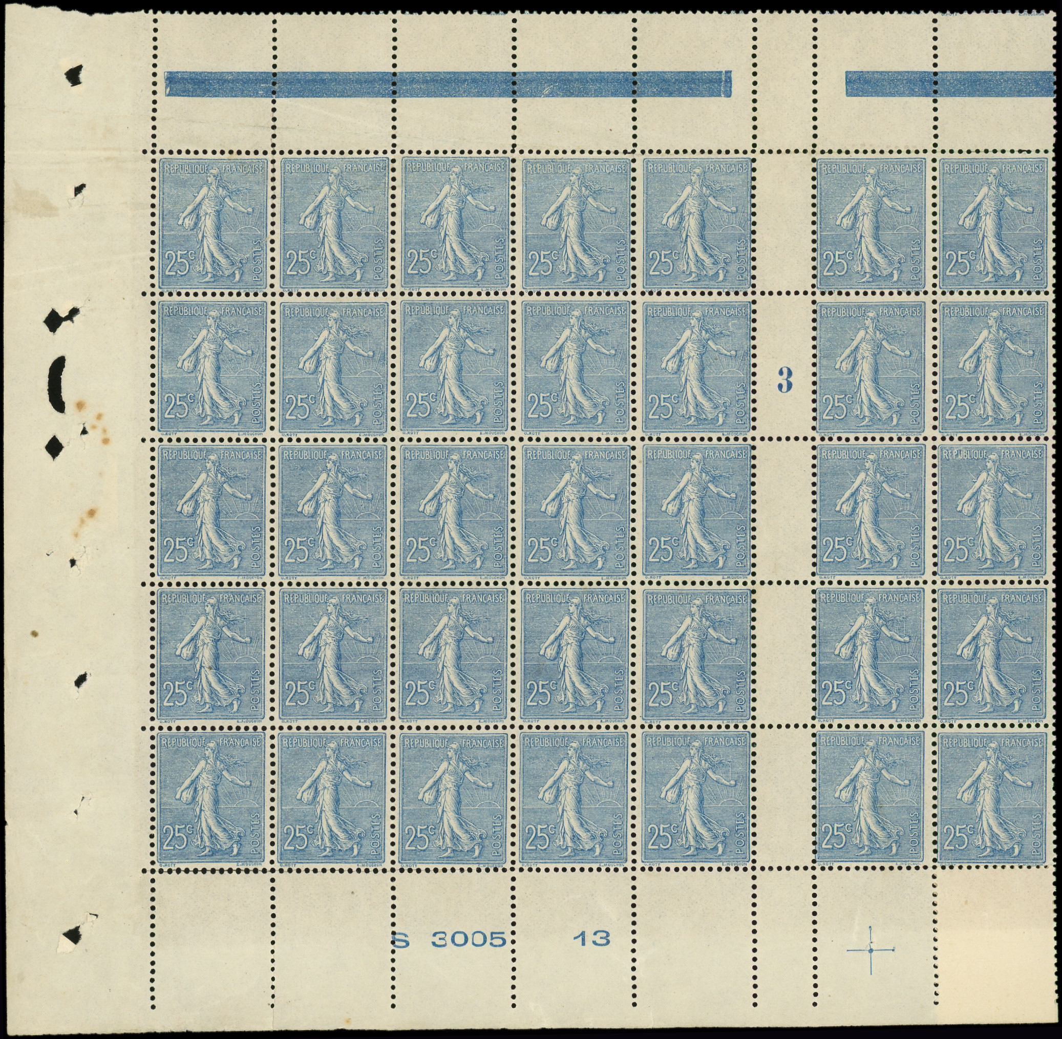 132 Semeuse Lignée, 25c. bleu, BLOC de 35 Mill.3, bas de feuille S3005 13, 4 t. avec lég. adh. et froissure d'origine style pli accordéon, sinon très frais et TB