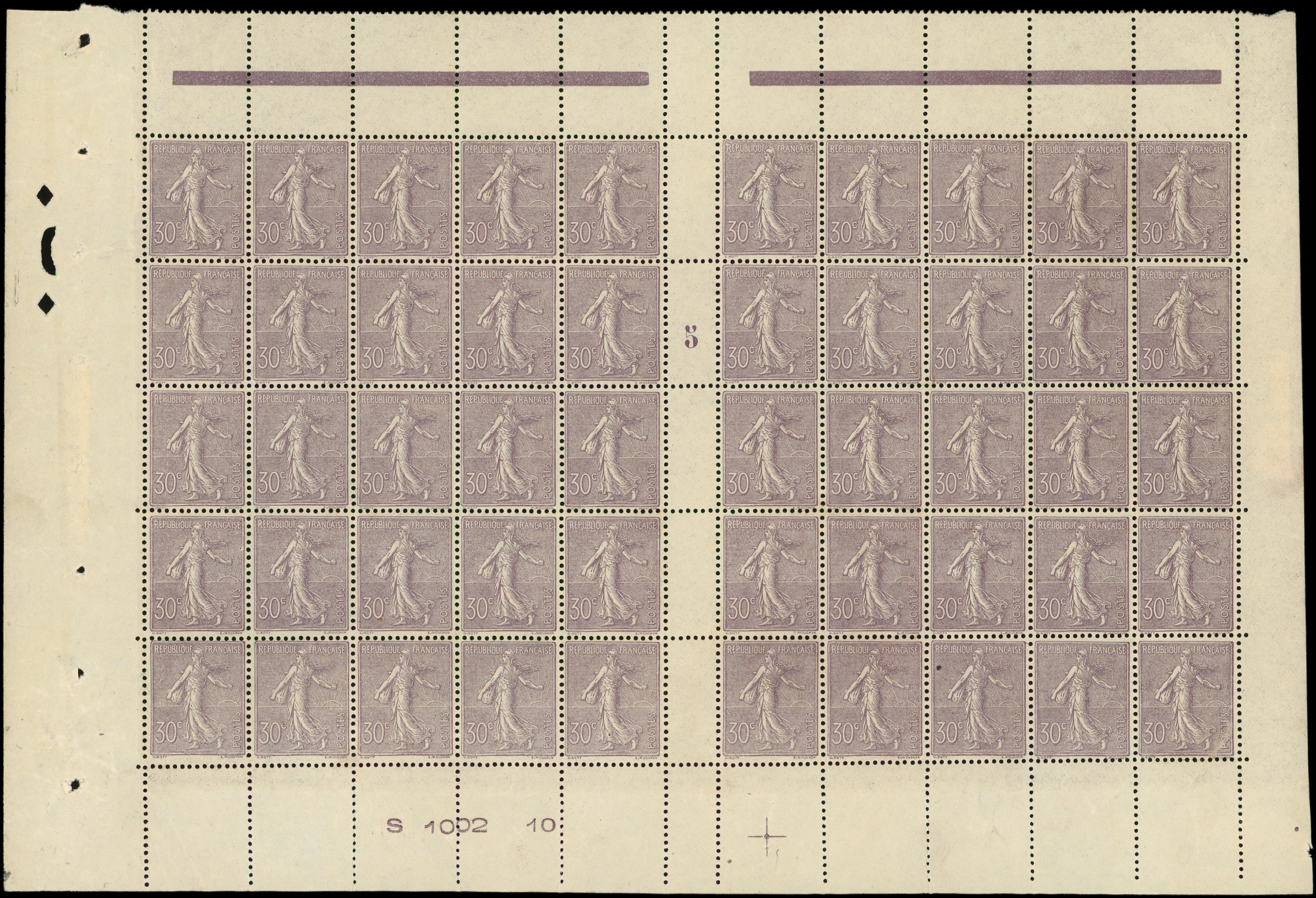 133 Semeuse Lignée, 30c. lilas, PANNEAU de 50 bas de feuille, Mill.5, très bon centrage d'ensemble, Superbe