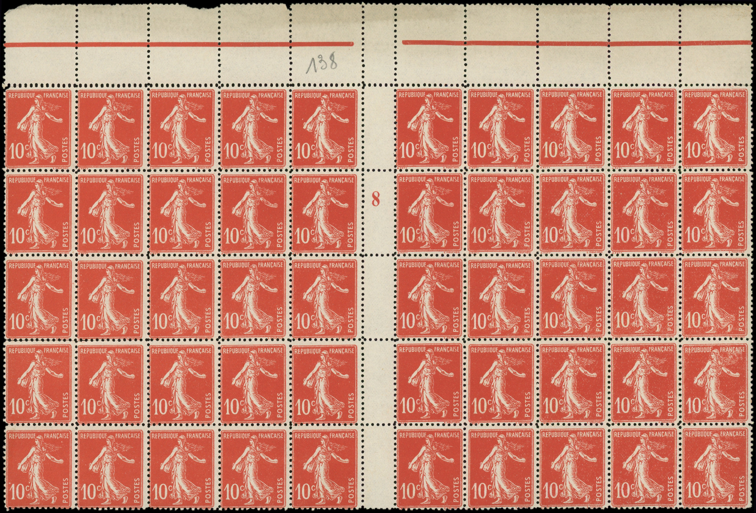 138 Semeuse Camée, 10c. rouge, 2 PANNEAUX de 50 Millés. 8 et 0, nuances très différentes, TB