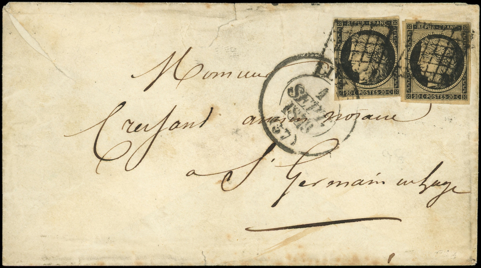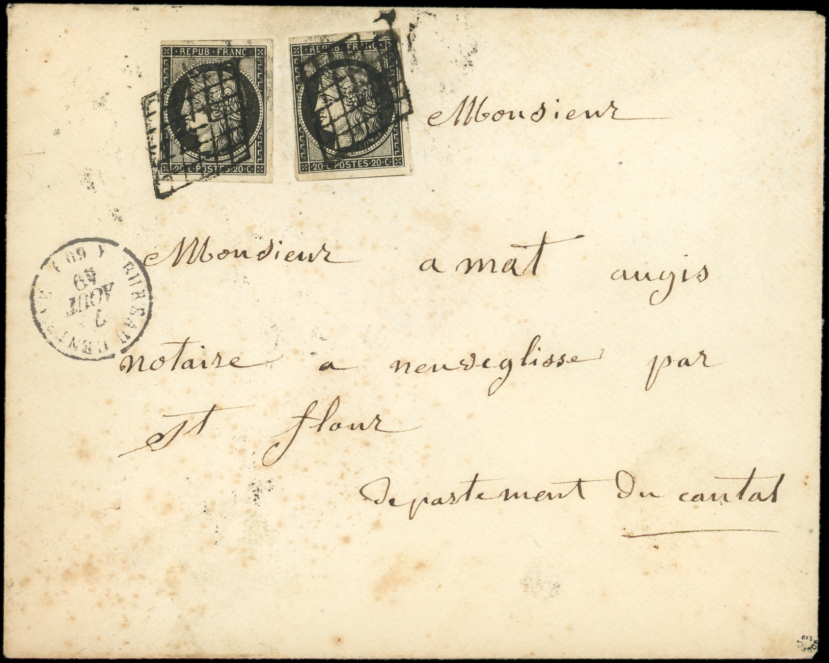 3a 20c. noir sur blanc (2 dont 1 le long du filet à g.), obl. GRILLE s. Env., càd T1301 NOIR BUREAU CENTRAL (ind.35) 7/8/49, arr. St Flour, RR et TB