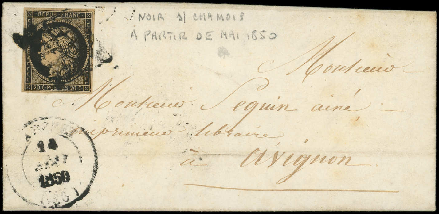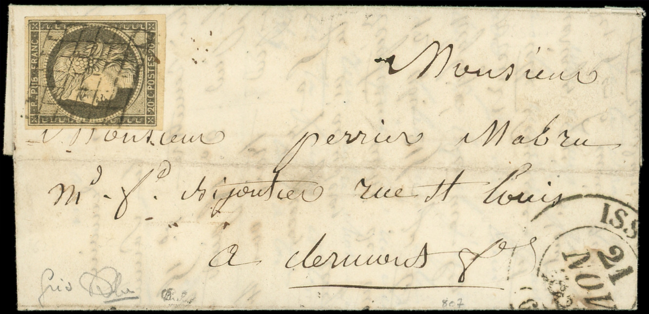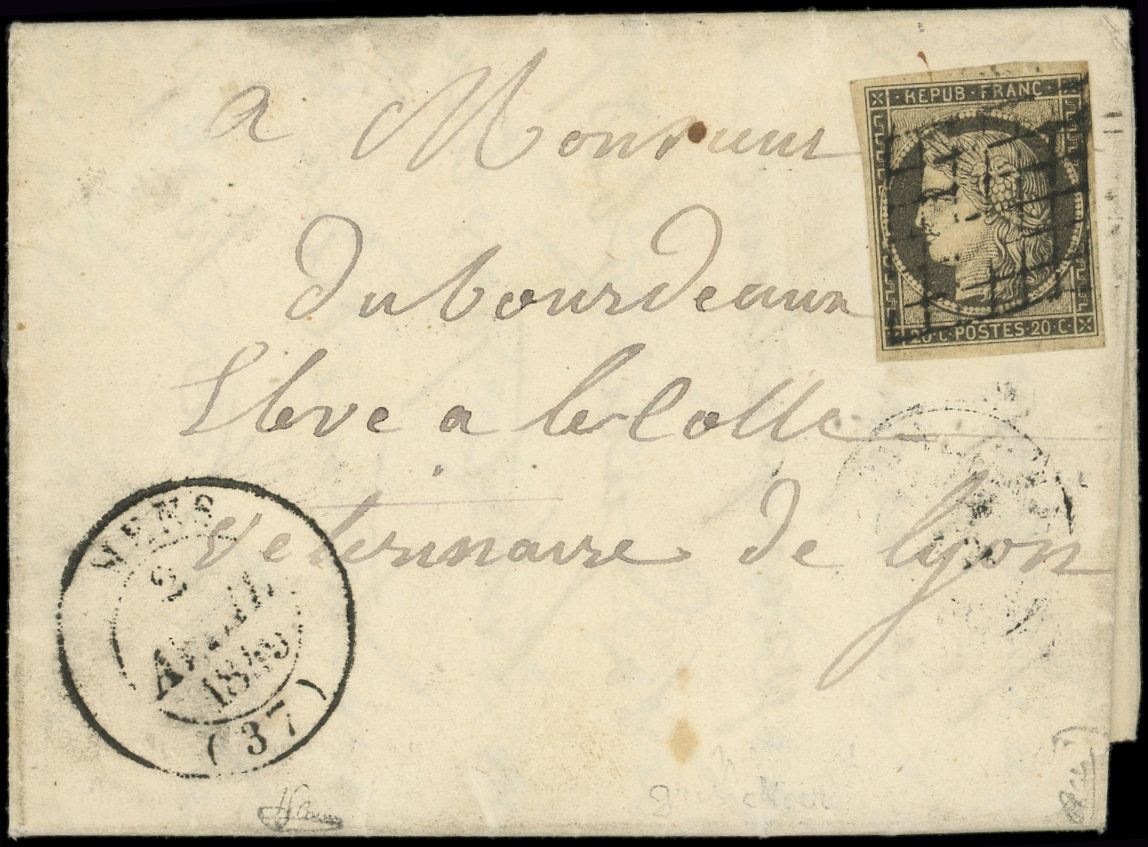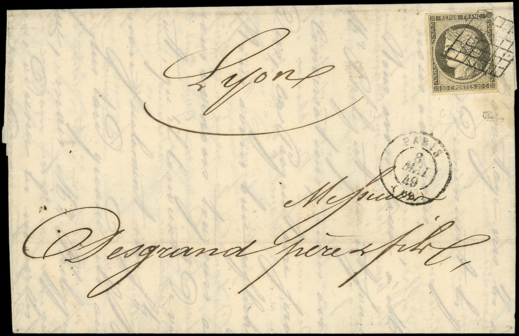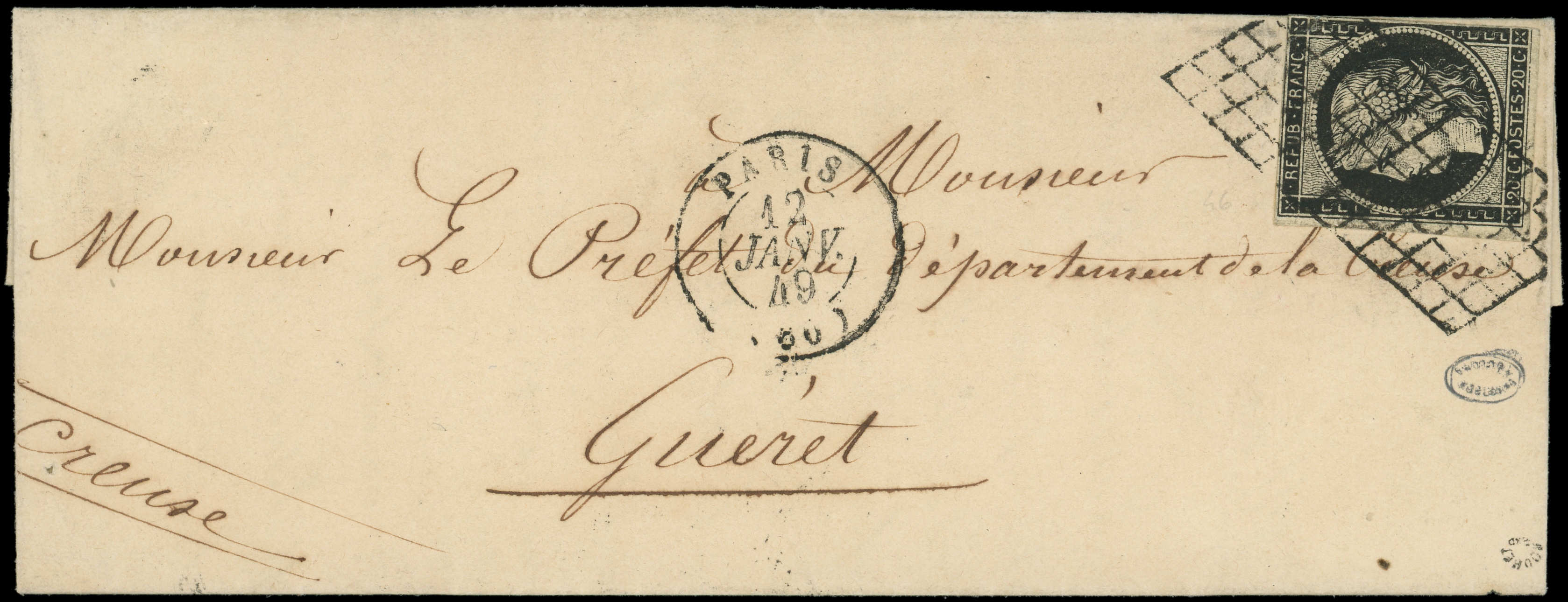 3a 20c. noir sur blanc, touché à droite, obl. GRILLE s. LAC, càd PARIS 12 JANV 49, 3e JOUR de la GRILLE, arr. GUERET le 13, une des 4 Lettres répertoriées, frappes TTB, certif. Roumet