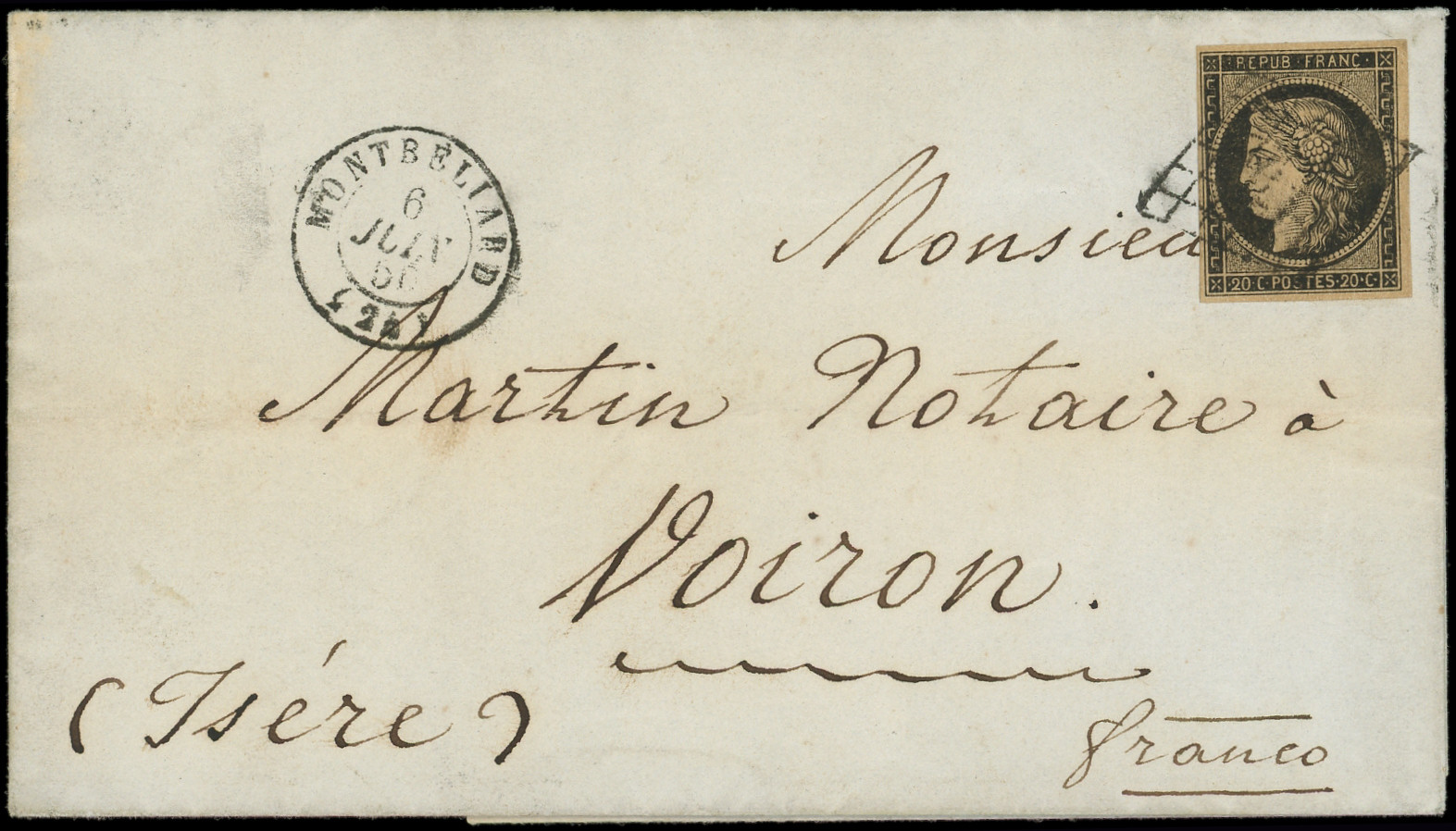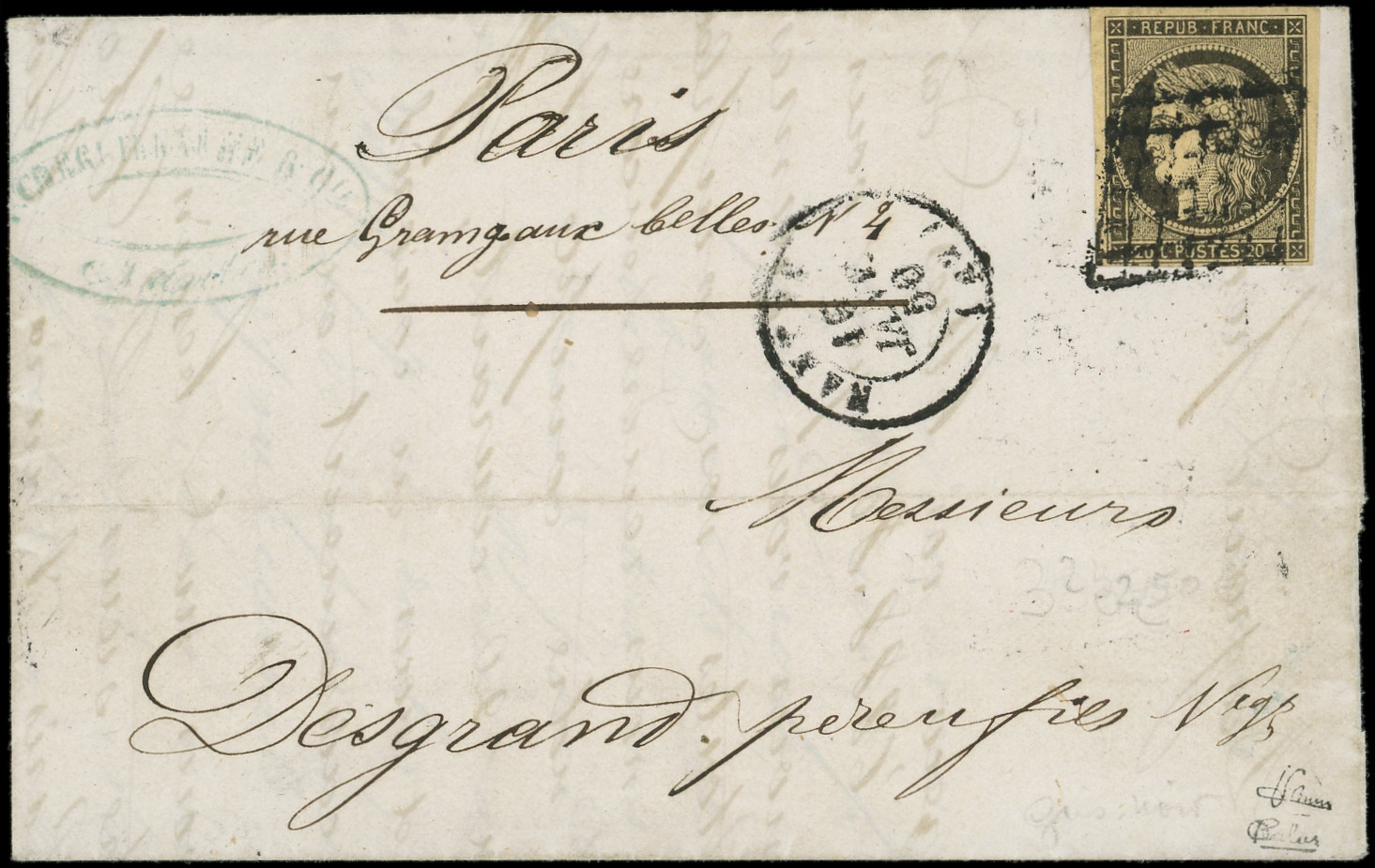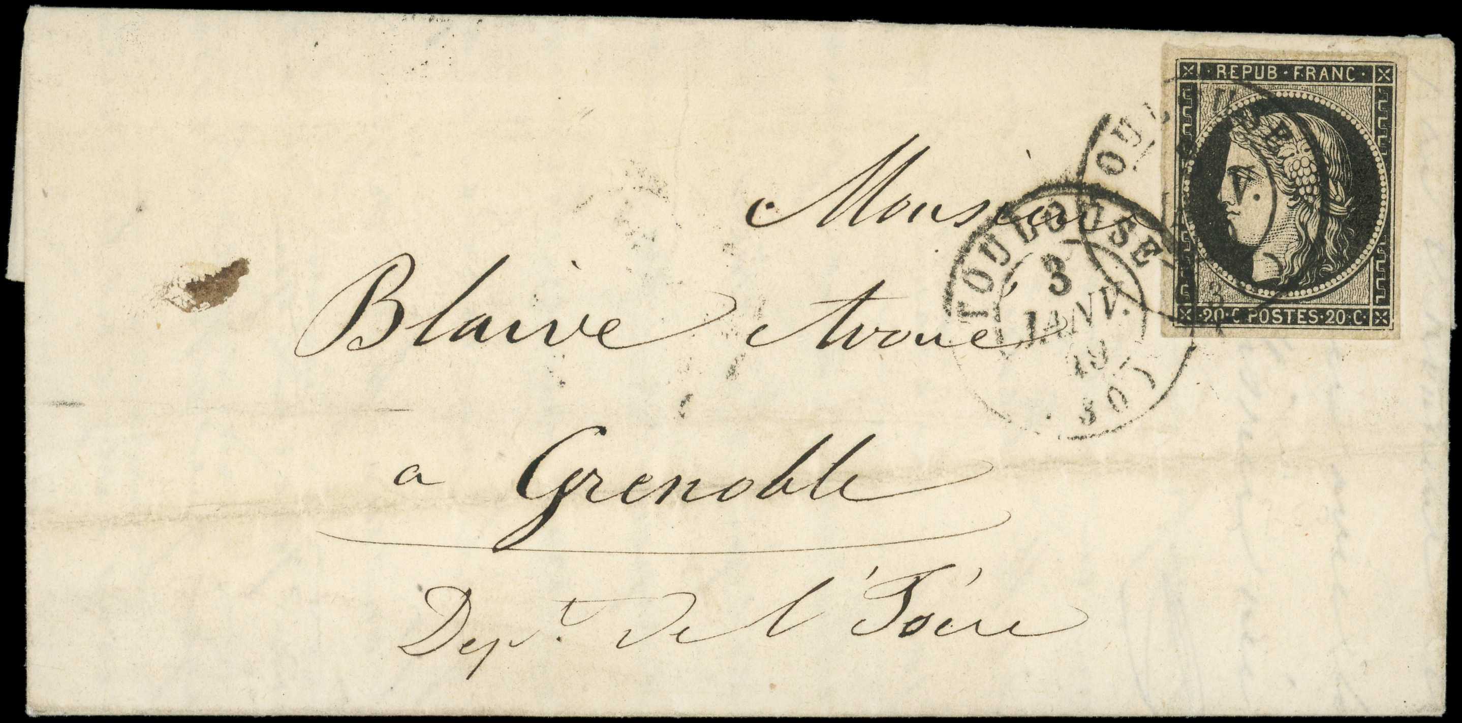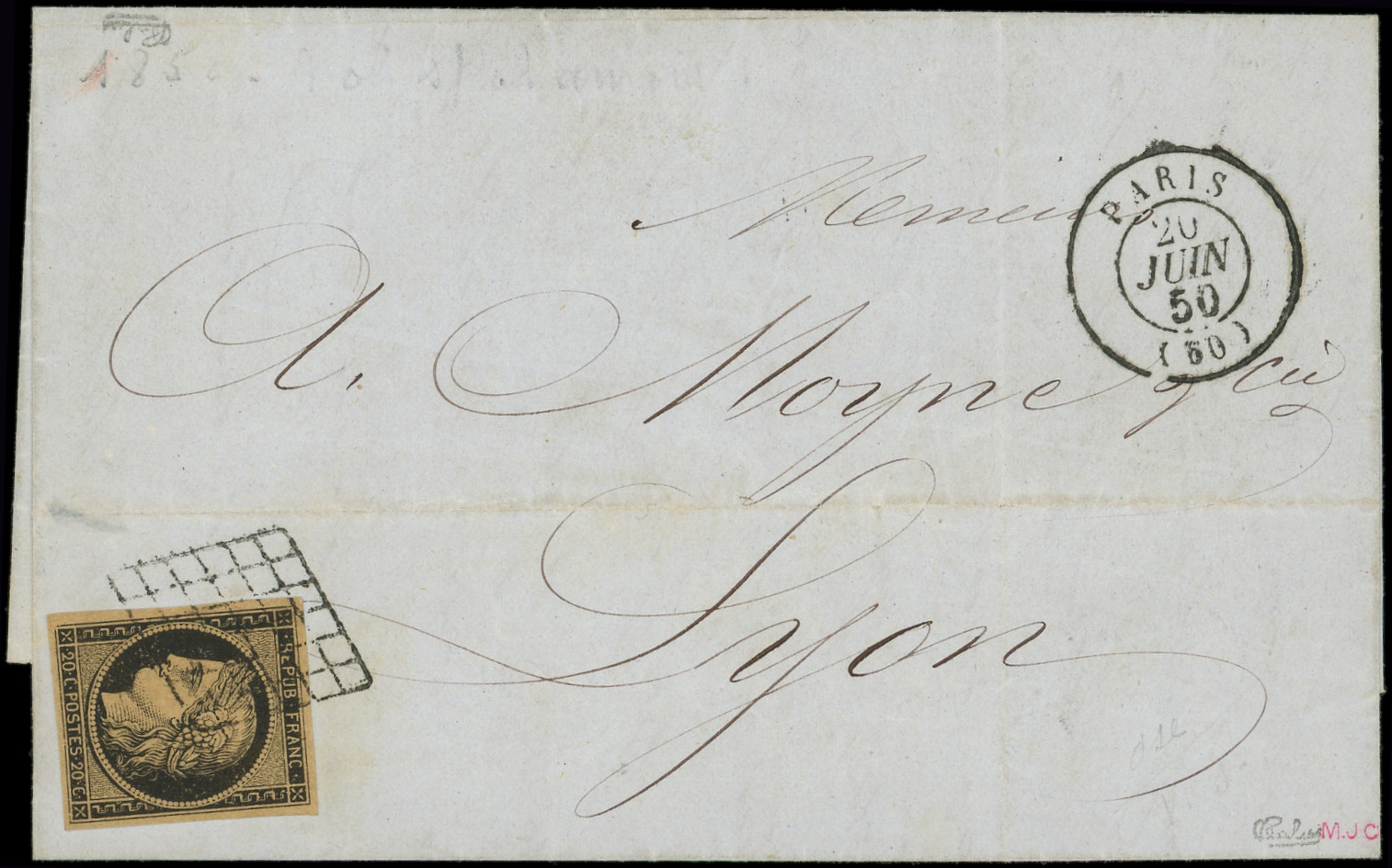 3a 20c. noir sur blanc, touché à droite, obl. GRILLE s. LAC, càd PARIS 12 JANV 49, 3e JOUR de la GRILLE, arr. GUERET le 13, une des 4 Lettres répertoriées, frappes TTB, certif. Roumet