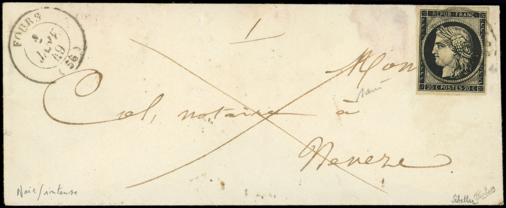 3h 20c. noir intense, obl. càd T15 FOURS 2 JANV 49 répété à côté s. Env., TB, certif. Scheller