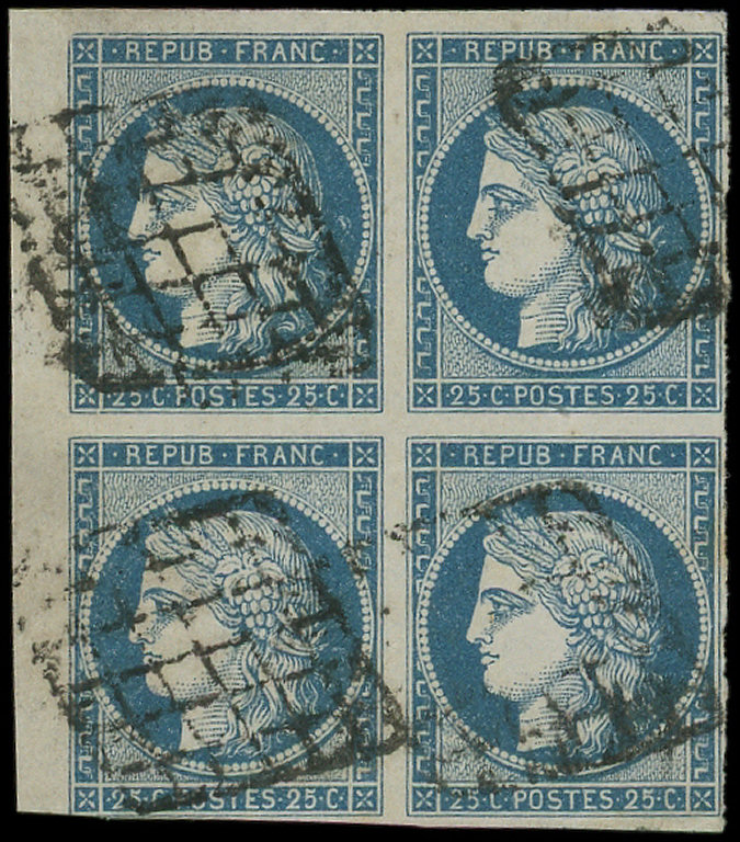 4 25c. bleu, BLOC de 4 petit bdf, obl. GRILLE, 1 ex. filet coupé dans un angle, les autres TB