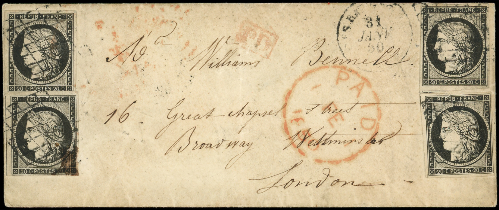 3a 20c. noir sur blanc, 4 ex. obl. GRILLE s. Env., càd T15 LES BATIGNOLES 31/1/50, arr. LONDON 1/2, TB