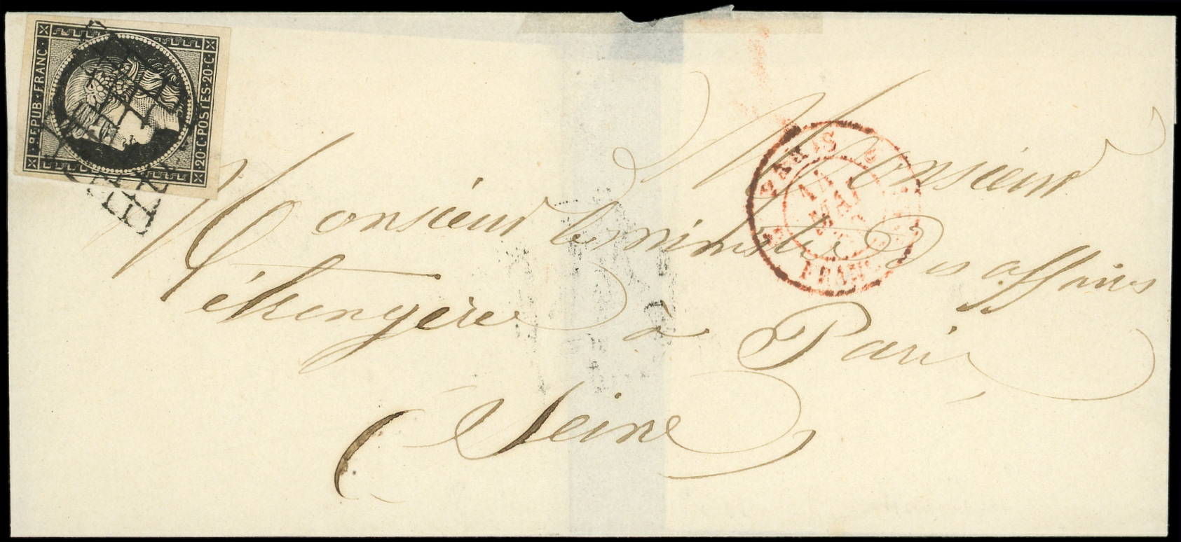 3a 20c. noir sur blanc, obl. GRILLE s. LSC adressée à M "le Ministre des affaires étrangères", càd rouge 3 PARIS 3 FRANCHISES 11/5/50, TTB