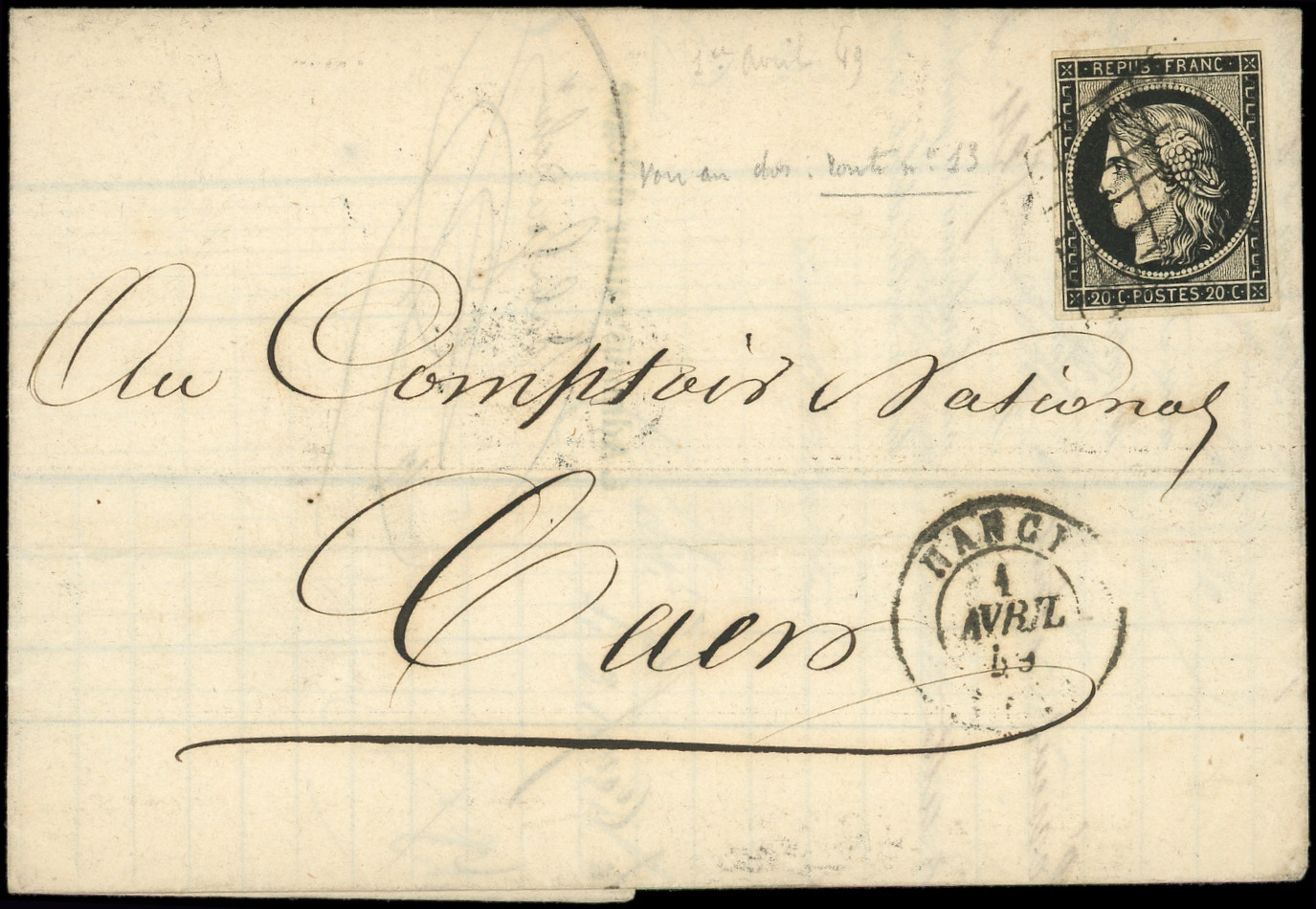 3h 20c. noir INTENSE, obl. GRILLE s. LAC, càd T15 NANCY 1/4/49 pour Caen, au verso càd ROUTE N°13/PARIS, TB