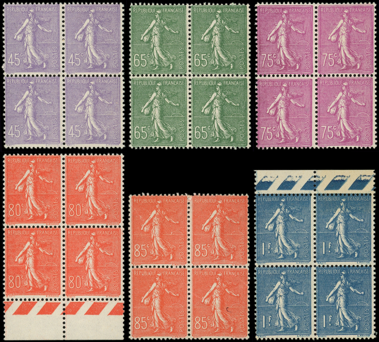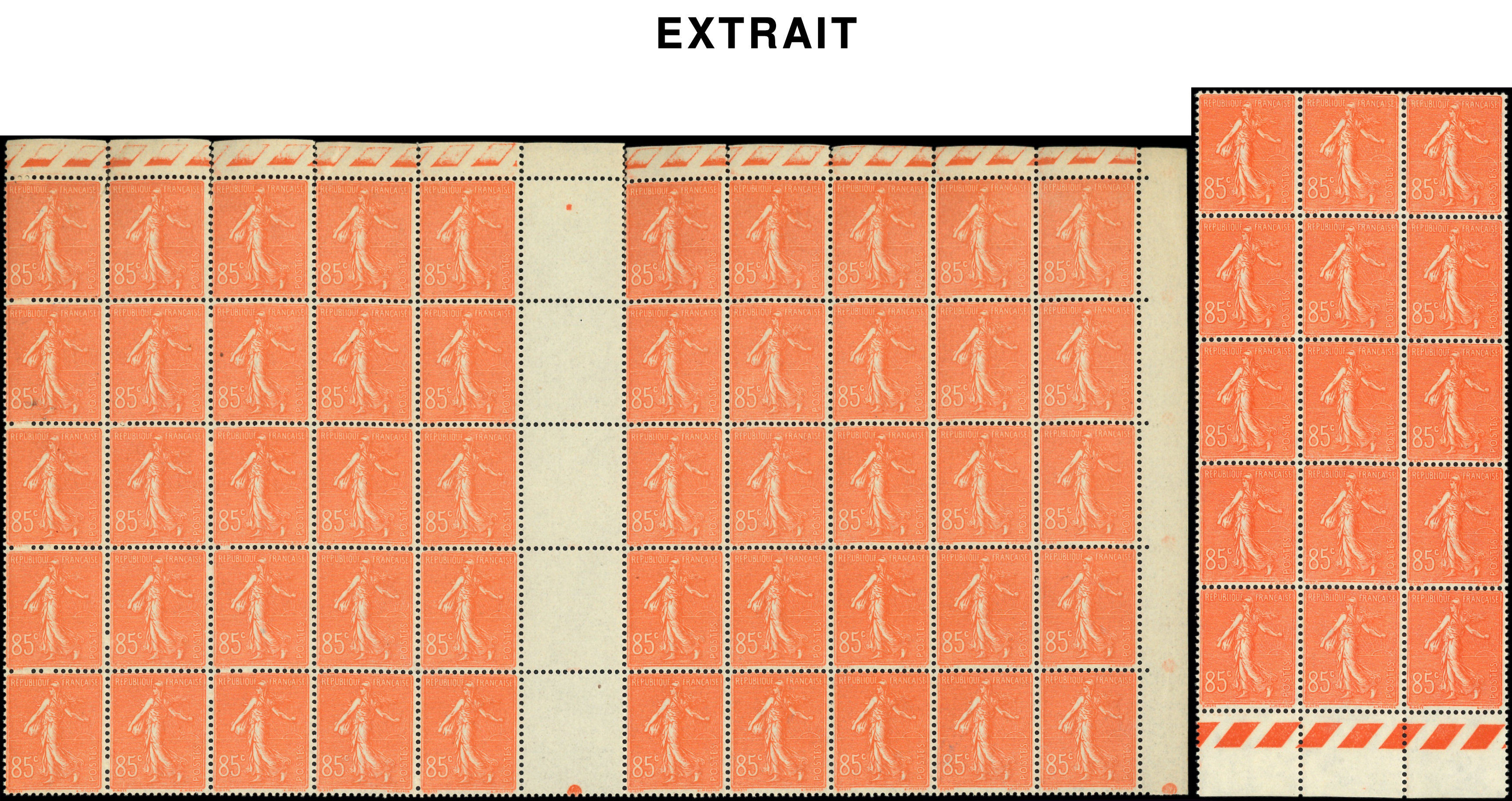 204 et 205 Semeuse Lignée, 85c. rouge 280 ex., 1f. bleu 50 ex. en panneaux, blocs ou égrainés, TB