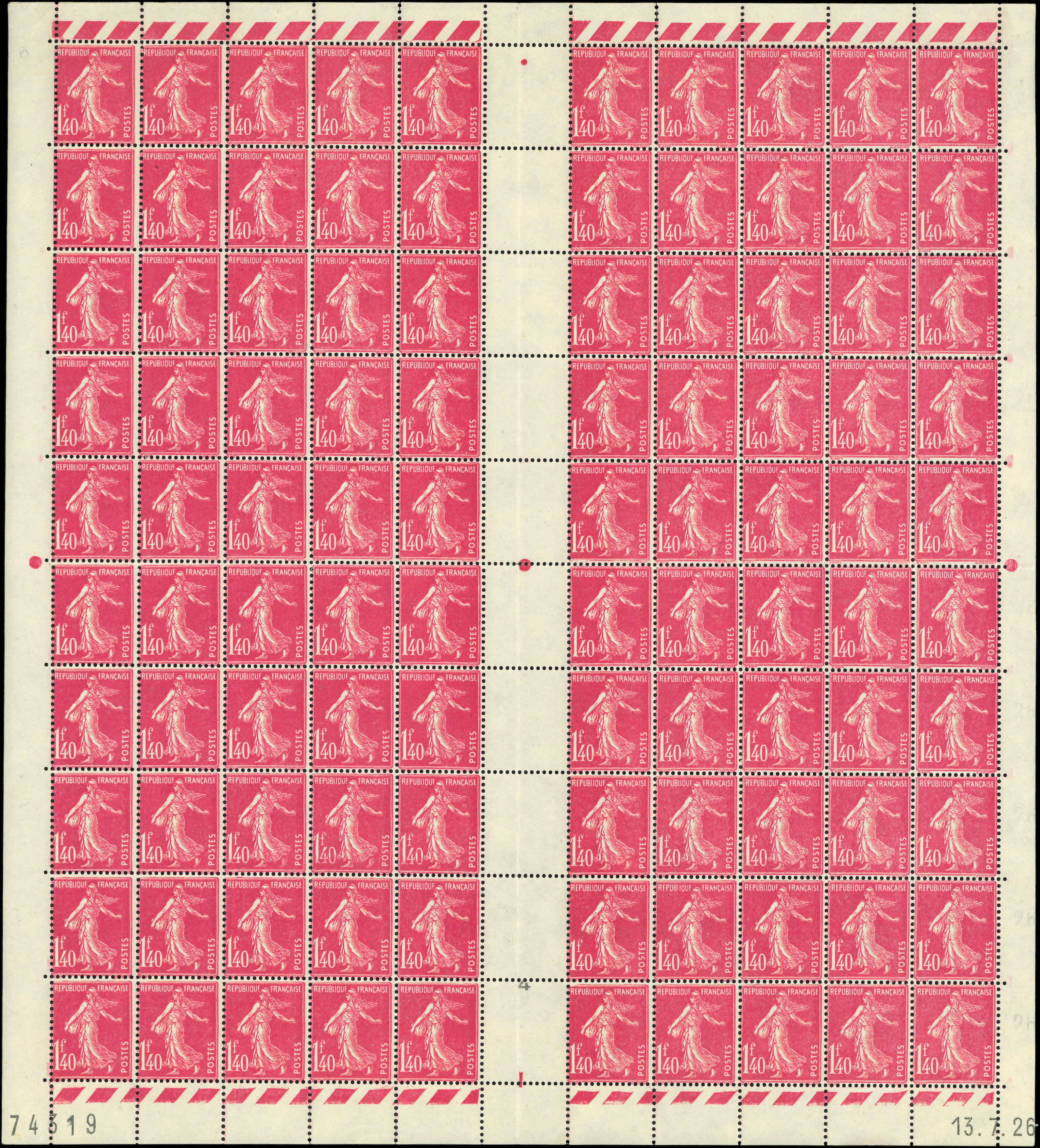 196 Semeuse Camée, 1f.40 rose, FEUILLE de 100 CD 13/7/26, TB