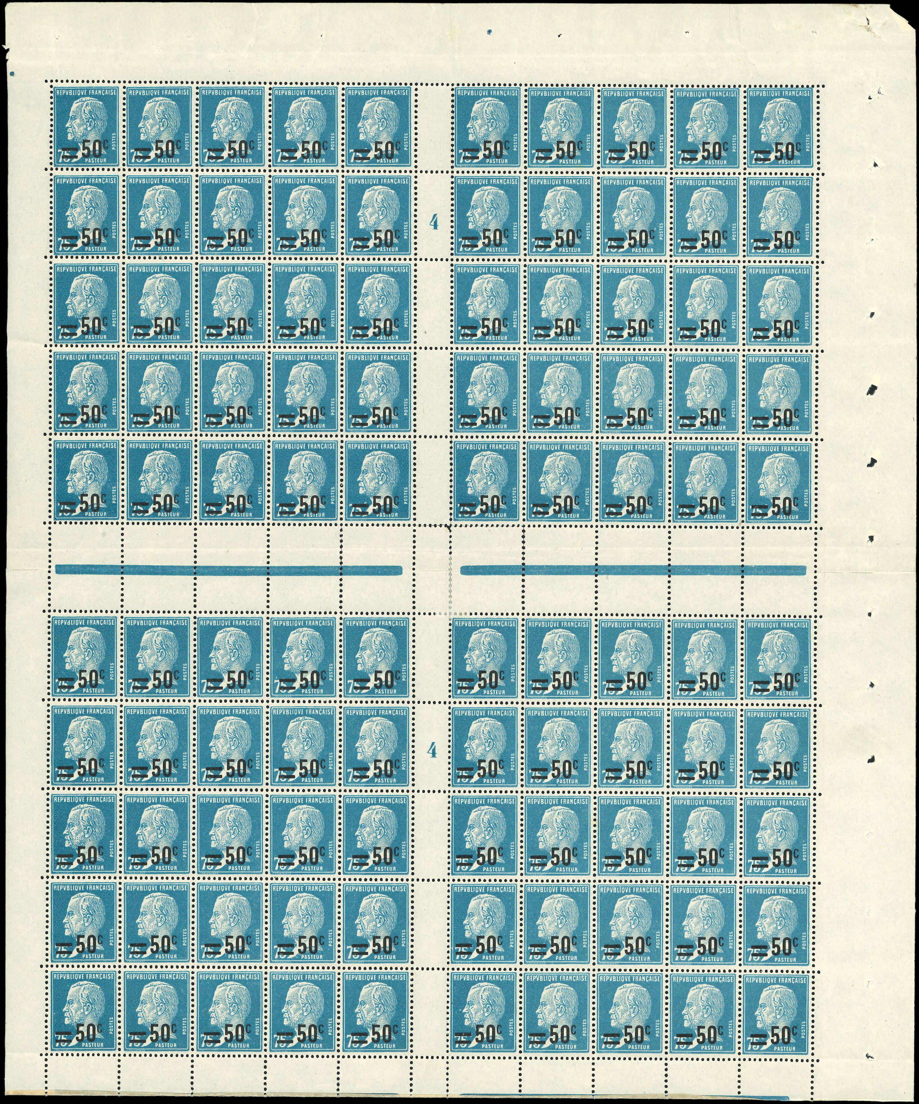 219 Pasteur, 50c. s. 75c. bleu, 2 PANNEAUX de 50 se tenant, TB