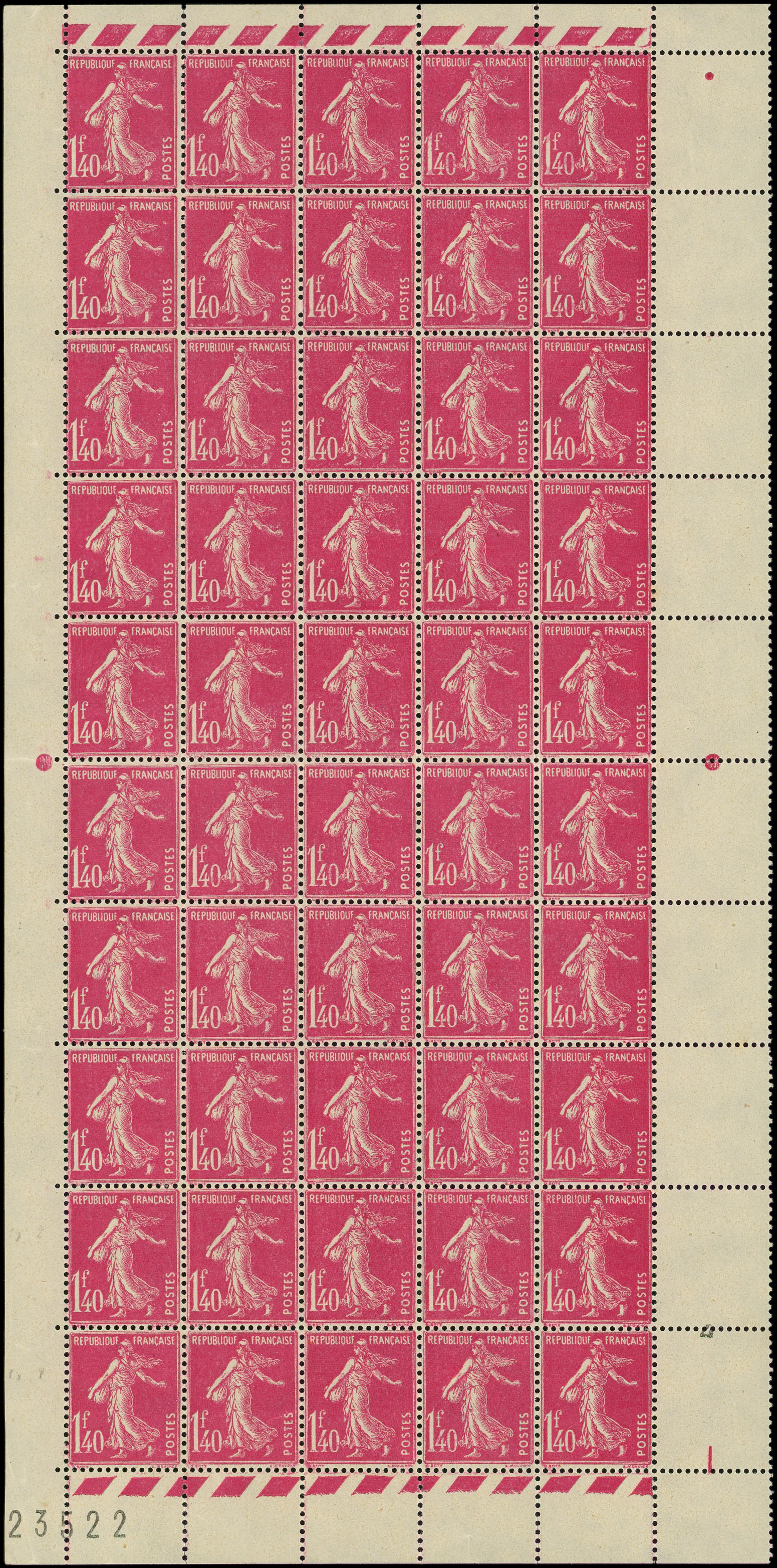 196 Semeuse Camée, 1f.40 rose, PANNEAU de 50, très bon centrage, TB
