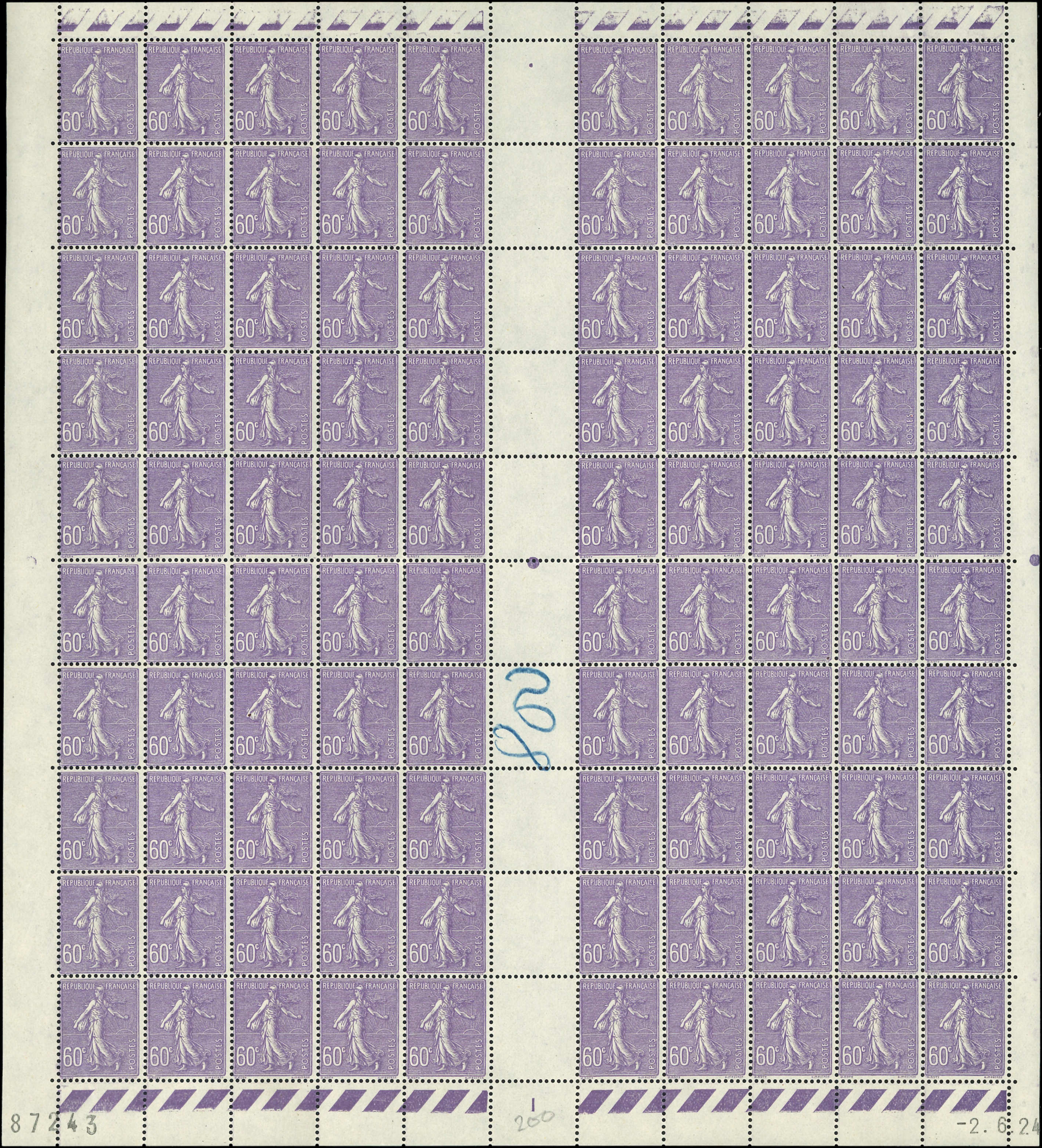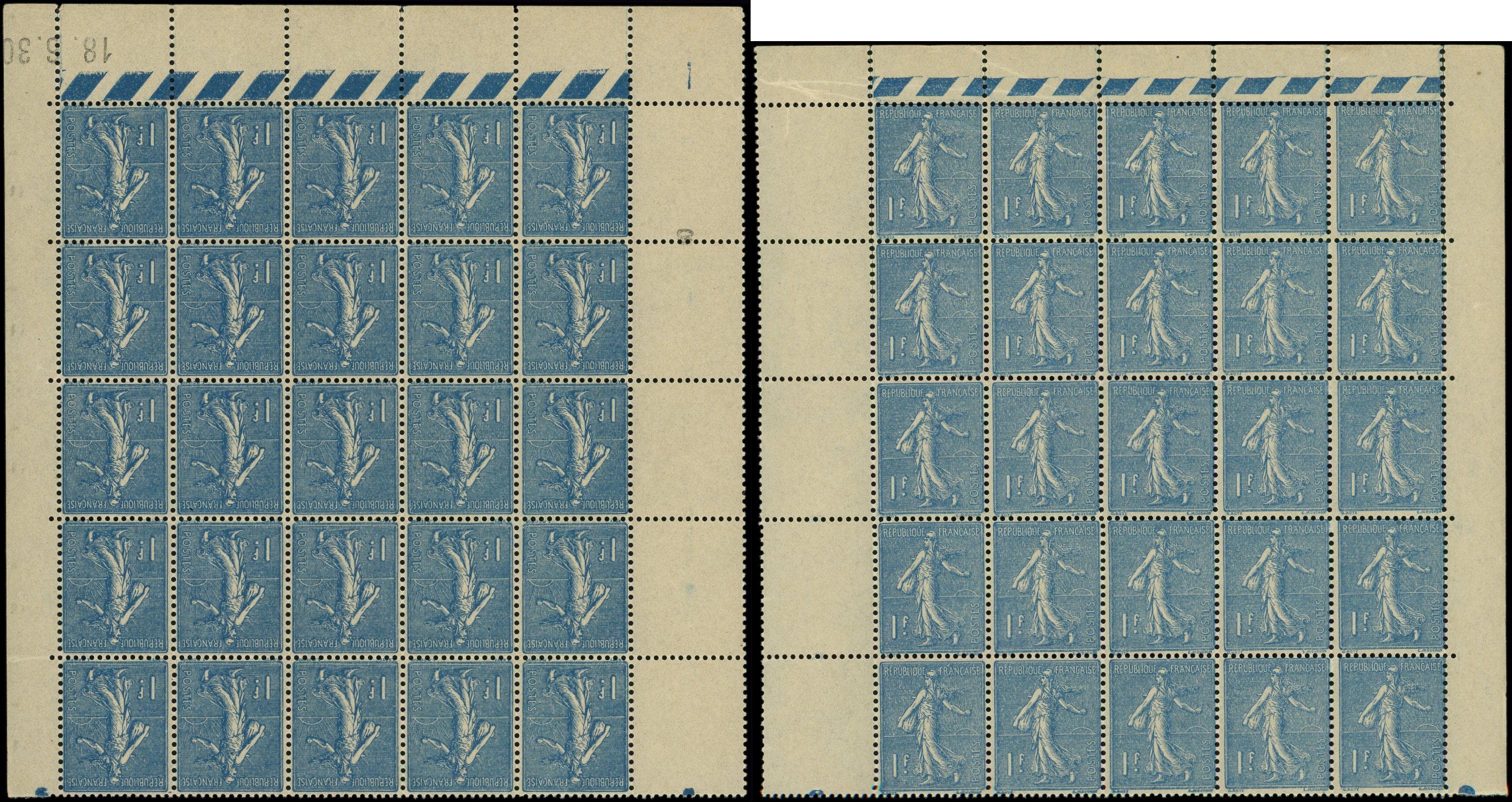 205 Semeuse Lignée, 1f. bleu, 2 PANNEAUX de 25, l'un des 2 nuance très foncée et CD 18/6/30, TB