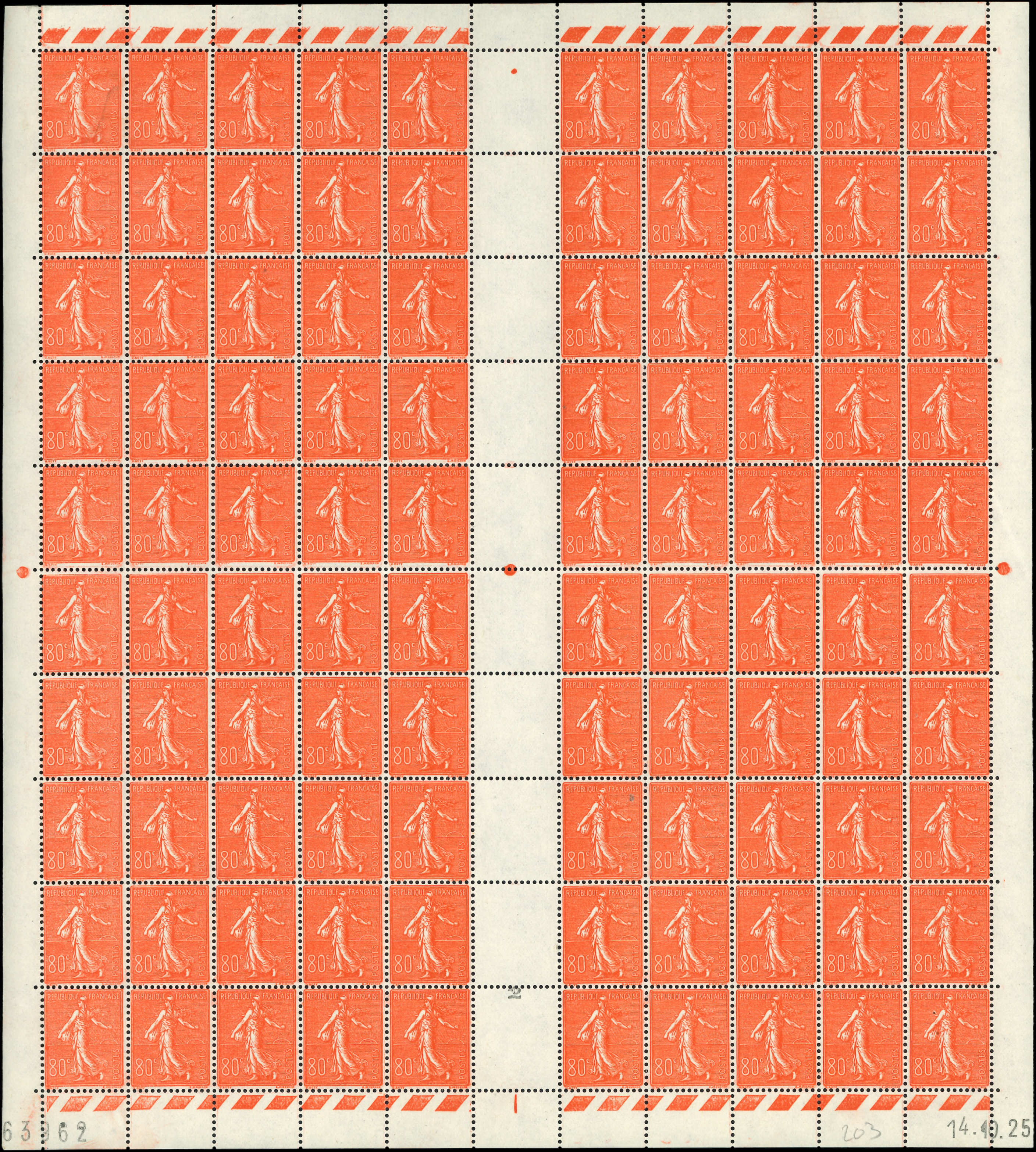 203 Semeuse Lignée, 80c. rouge, FEUILLE de 100 CD 14/10/25, TB