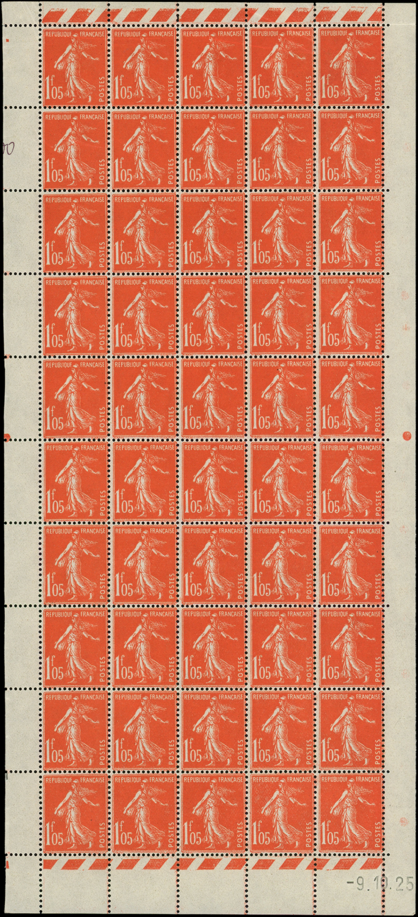 195 Semeuse Camée, 1f.05 vermillon, PANNEAU de 50 CD 9/10/25, 4 ex. froissure bande supérieure, sinon TB