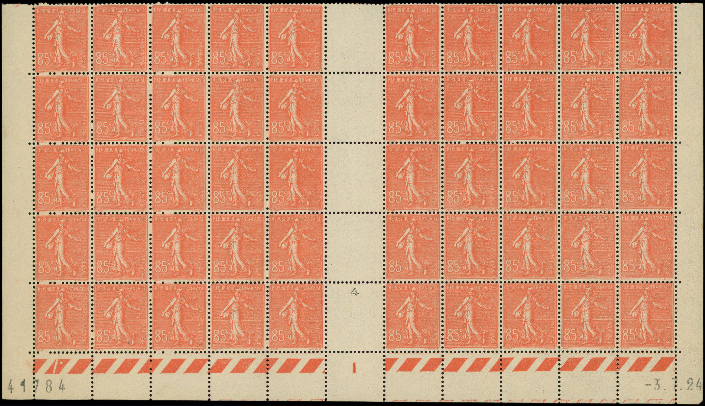 204 Semeuse Lignée, 85c. rouge, PANNEAU de 50, CD 3/7/24, TB