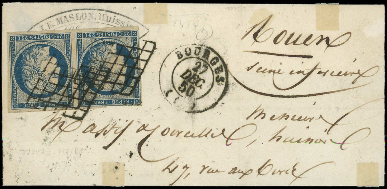4 25c. bleu, PAIRE obl. GRILLE s. LSC, càd T15 BOURGES 27/12/50, TB