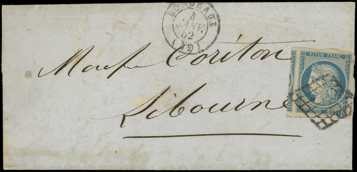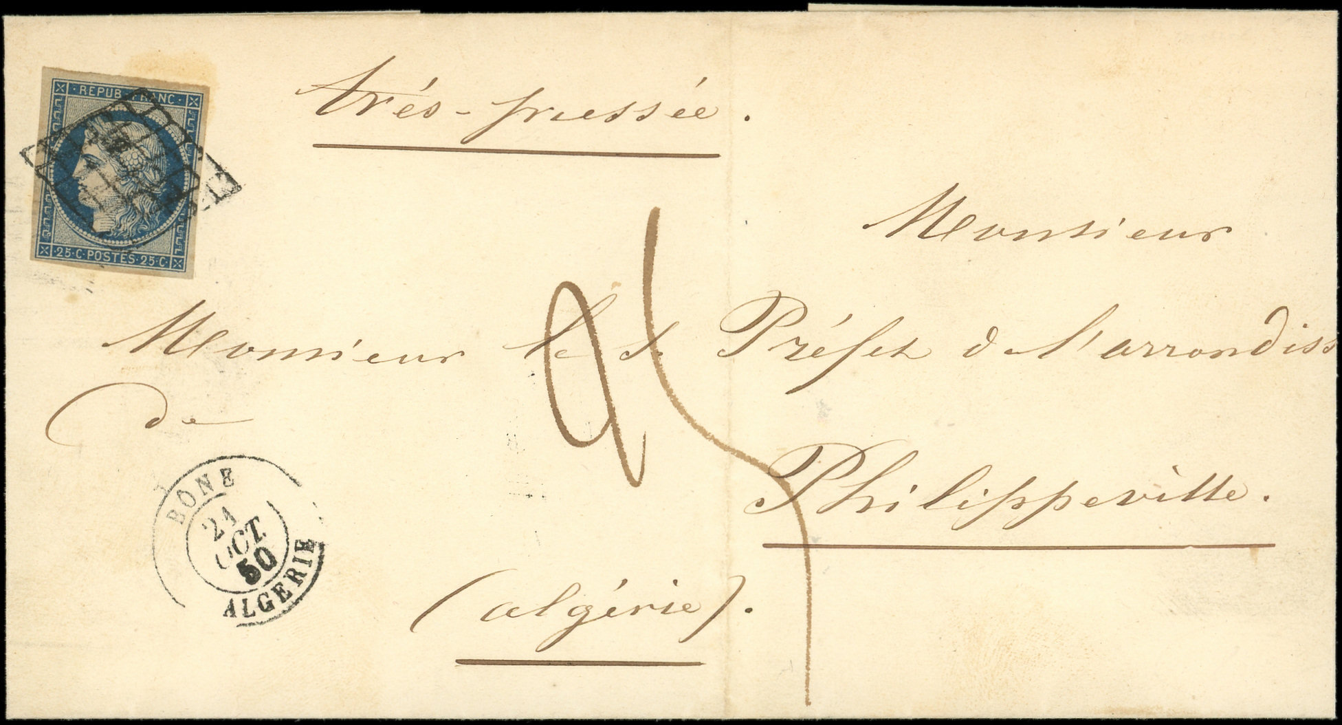 4 25c. bleu, obl. GRILLE s. LSC "très pressée", càd BONE ALGERIE 21/10/50, TAXE 25 plume, arr. PHILIPPEVILLE 22/10, TTB