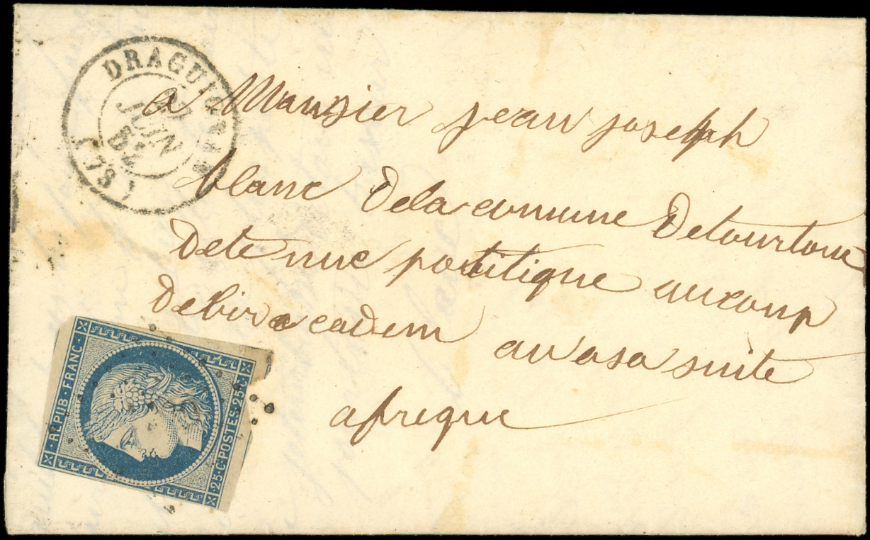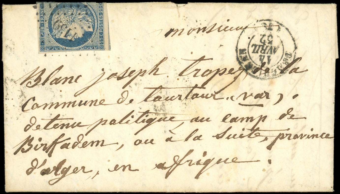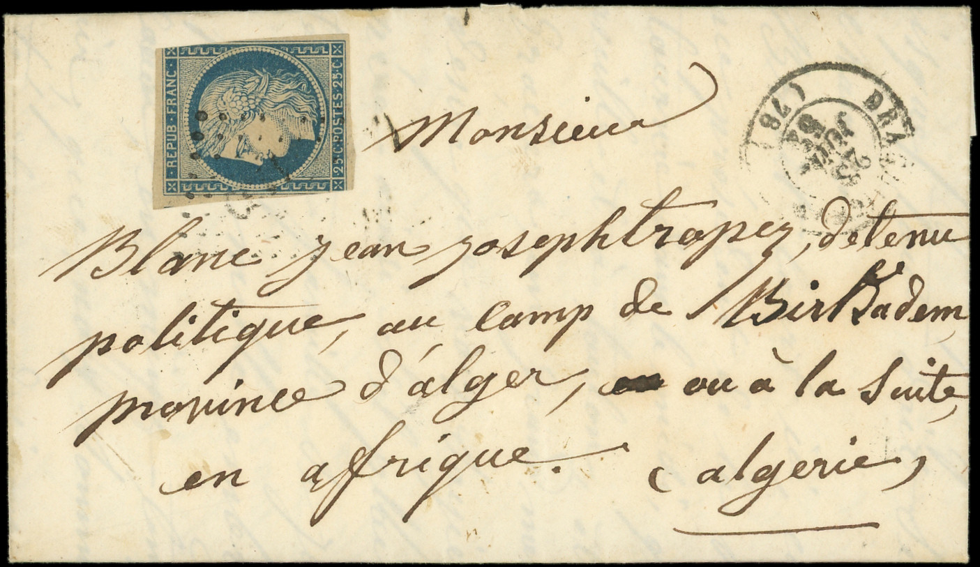 4 25c. bleu, défx, obl. PC 1139 sur LAC, càd DRAGUIGNAN 23/7/52 pour le camp de BIRKADEM, TB