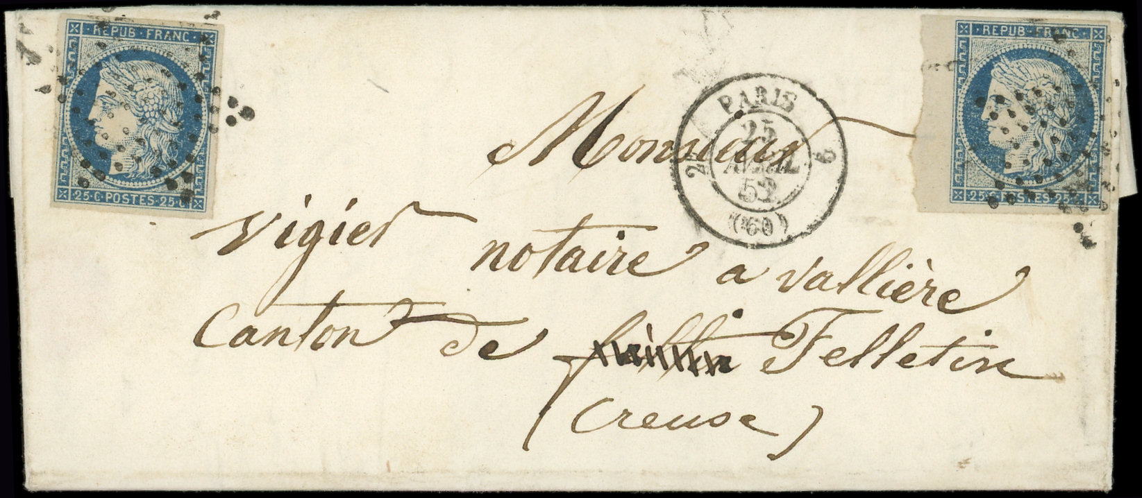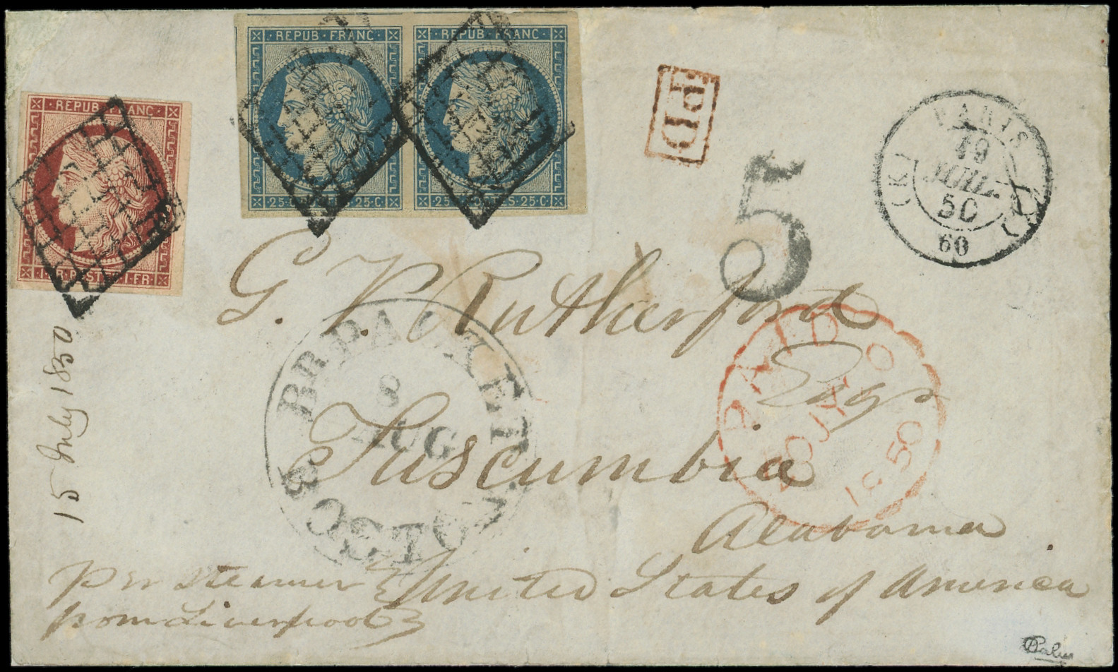 4 et 6, 25c. bleu PAIRE marges énormes et 1f. carmin, obl. GRILLE s. Env., càd (K) PARIS (K) 19/7/50, passage BOSTON 8/8 pour TUSCUMBIA ALABAMA, TTB