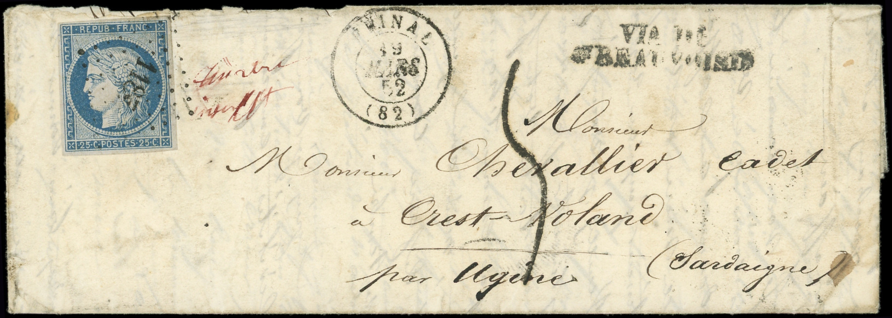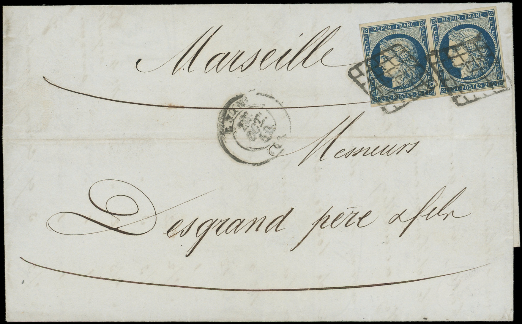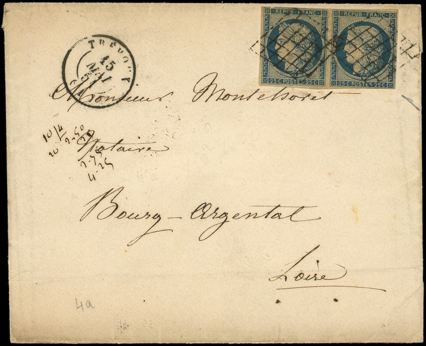 4 25c. bleu (2) obl. GRILLE SANS FIN s. LAC, càd PARIS 31/3/52, arr. càd SARDE UGINE 3/4, TB. C