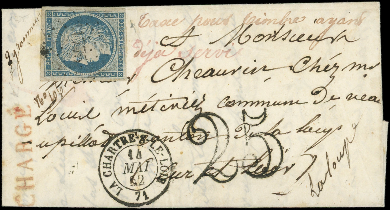 4 25c. bleu, obl. s. LAC avec "Taxe pour timbre ayant déjà servi", càd T15 LA CHARTRE-S-LE-LOIR 14/5/62, Taxe 25 DT et CHARGE, arr. càd T14 LA LOUPE 16/5, TTB