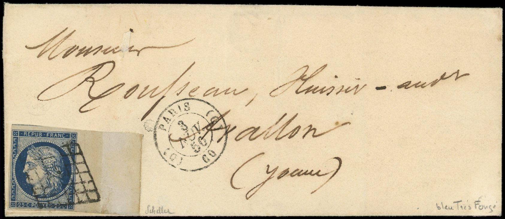4a 25c. bleu TRES foncé, BORD de FEUILLE intégral, obl. GRILLE s. Env., càd PARIS 3/11/50, arr. AVALLON 4/11, Superbe. S
