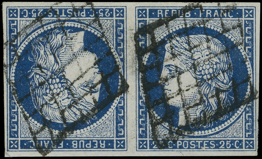 4a 25c. bleu foncé, PAIRE (2 infimes défauts) obl. GRILLE s. Env., càd T15 PARIS 15/5/51, TB