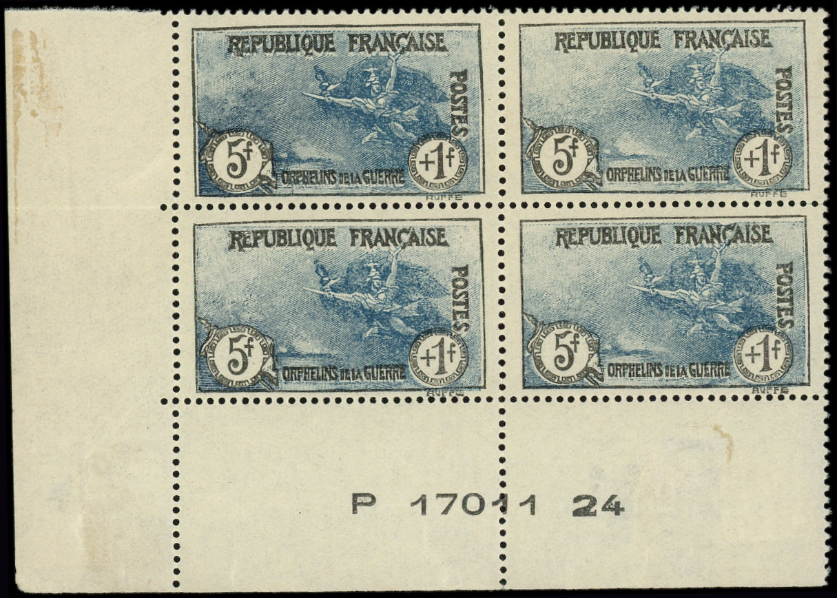 232 3ème série Orphelins, 5f. + 1f. noir et bleu, BLOC de 4 cdf N°P 17011-24, TB