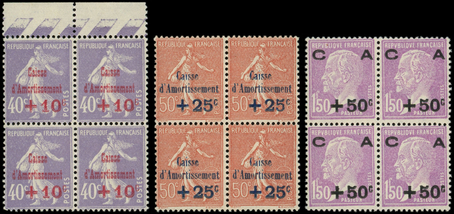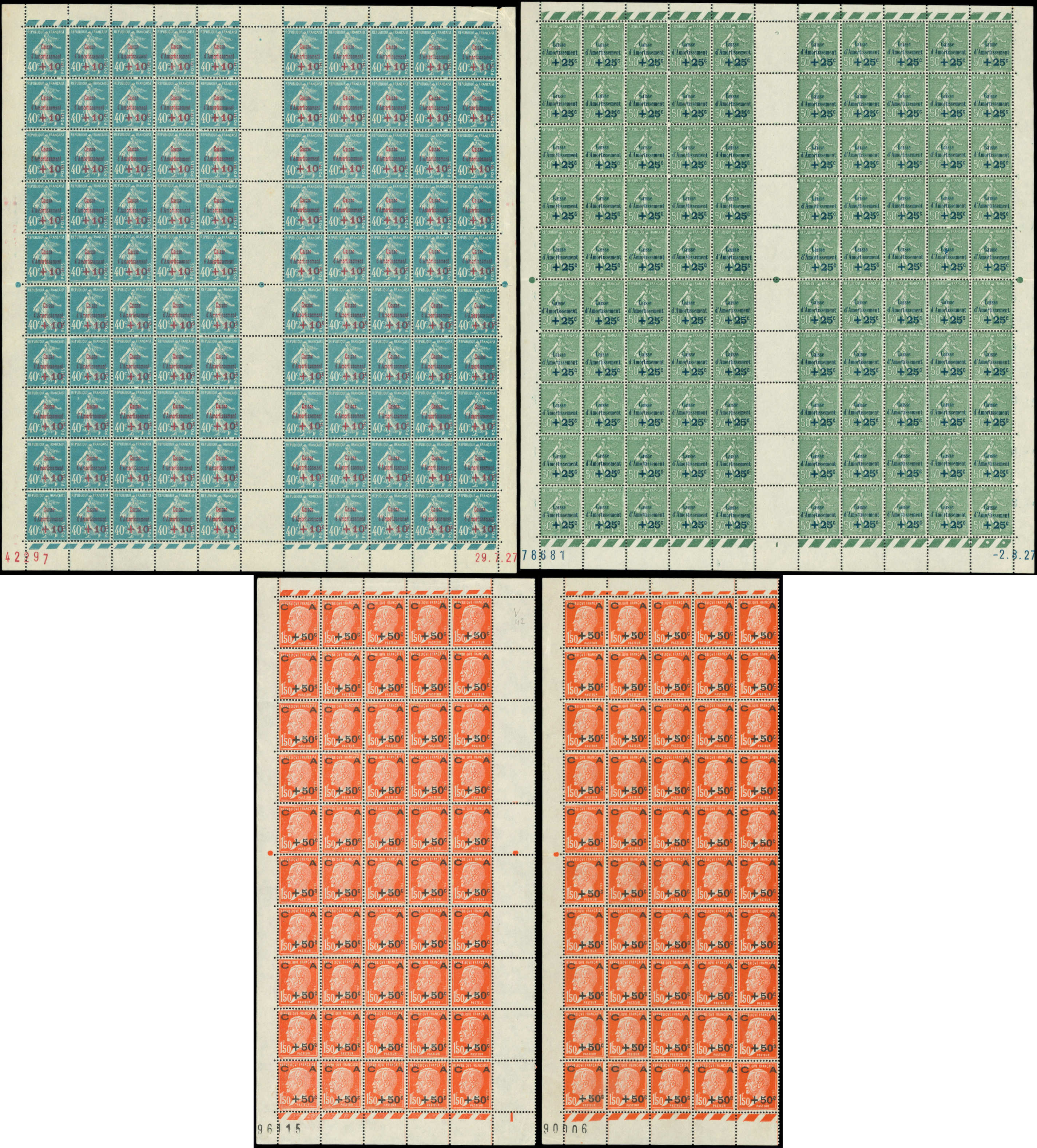 246/48 1ère série Amortissement, N°246/47 en FEUILLES de 100, N°248 en 2 PANNEAUX de gauche de 50, très bon centrage d'ensemble, TB