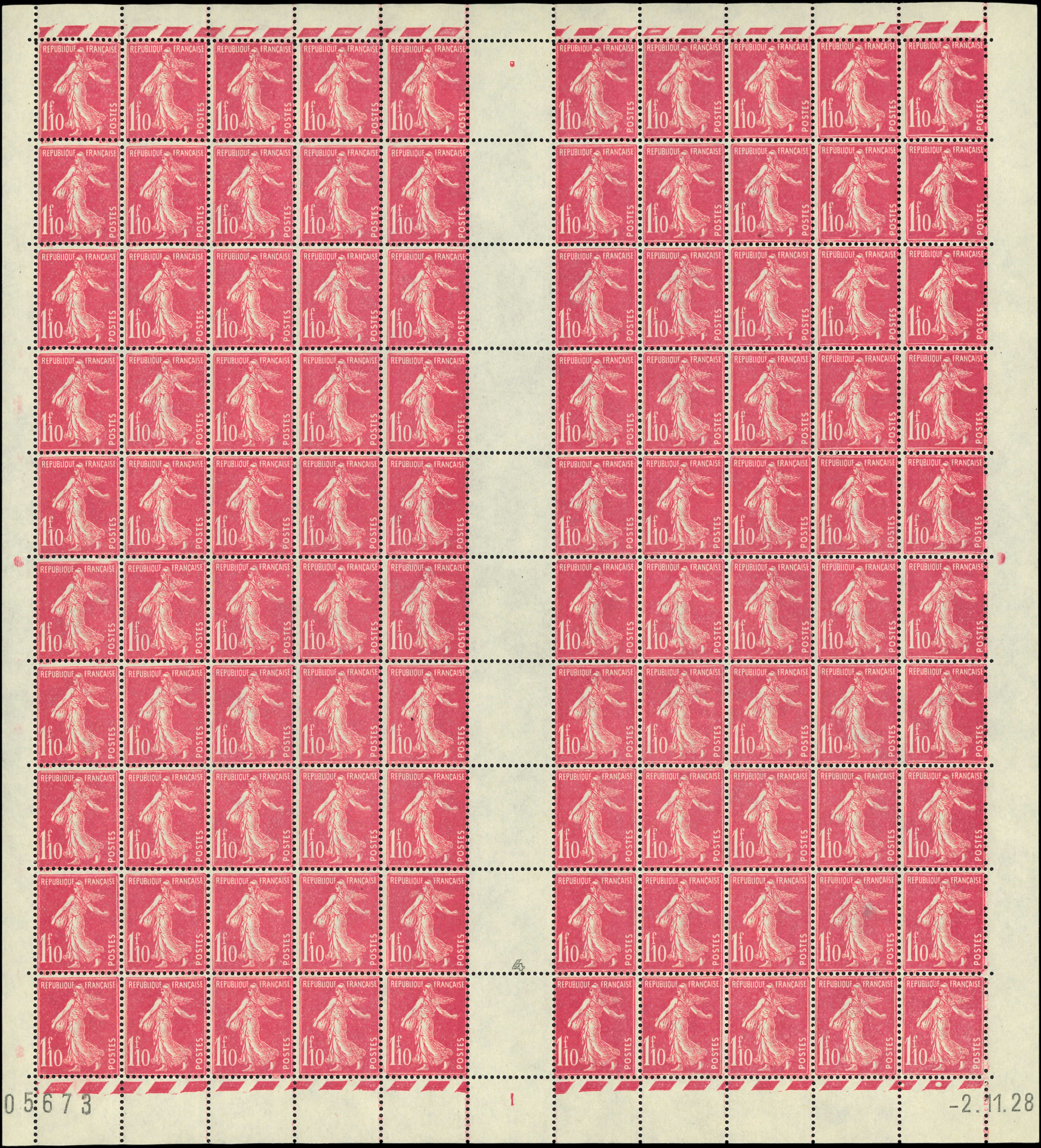 238 Semeuse Camée, 1f.10 rose, FEUILLE de 100, CD 2/11/28, TB