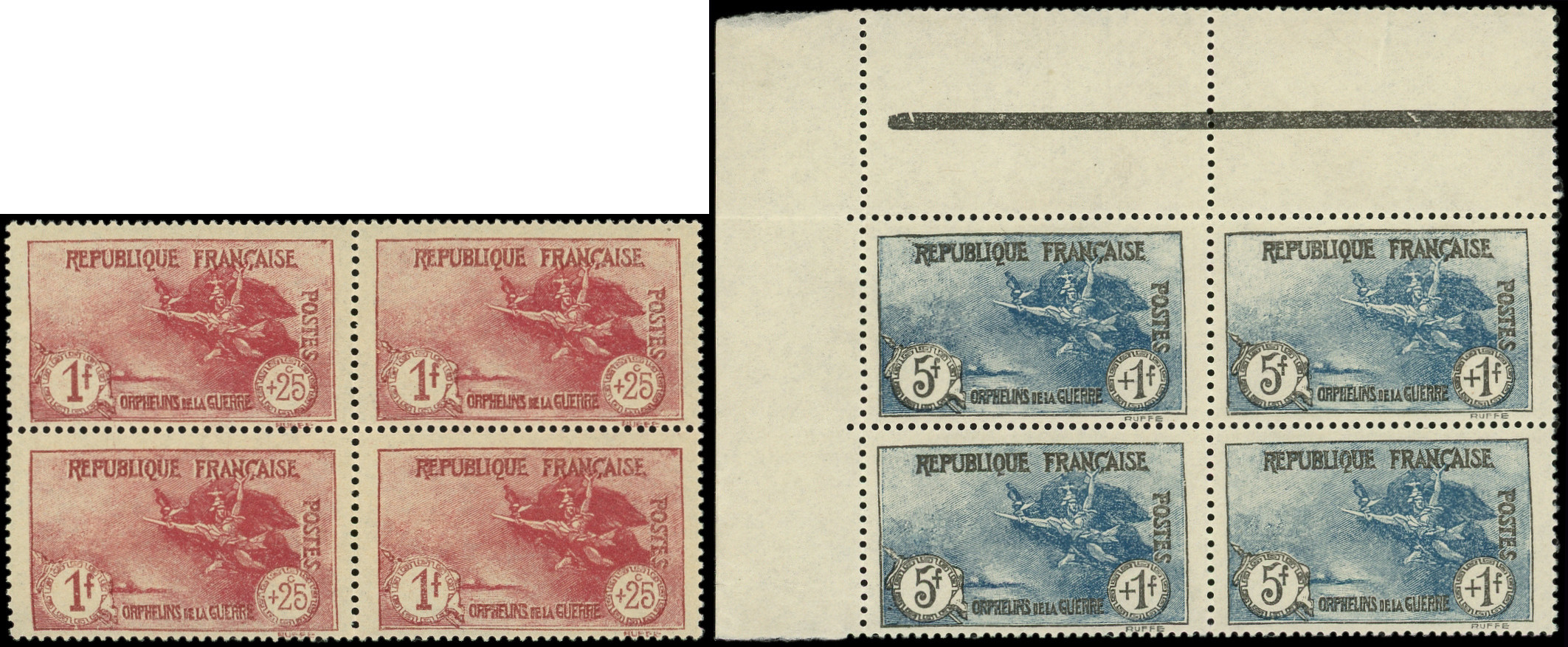 231/32 3ème Orphelins, 1f. + 25c. carmin et 5f. + 1f. bleu et noir, en BLOCS de 4, N°232 cdf, TB