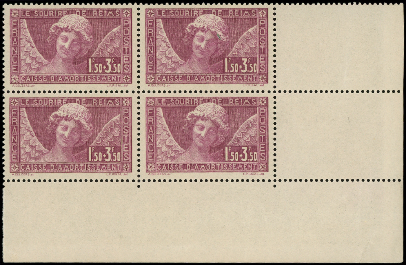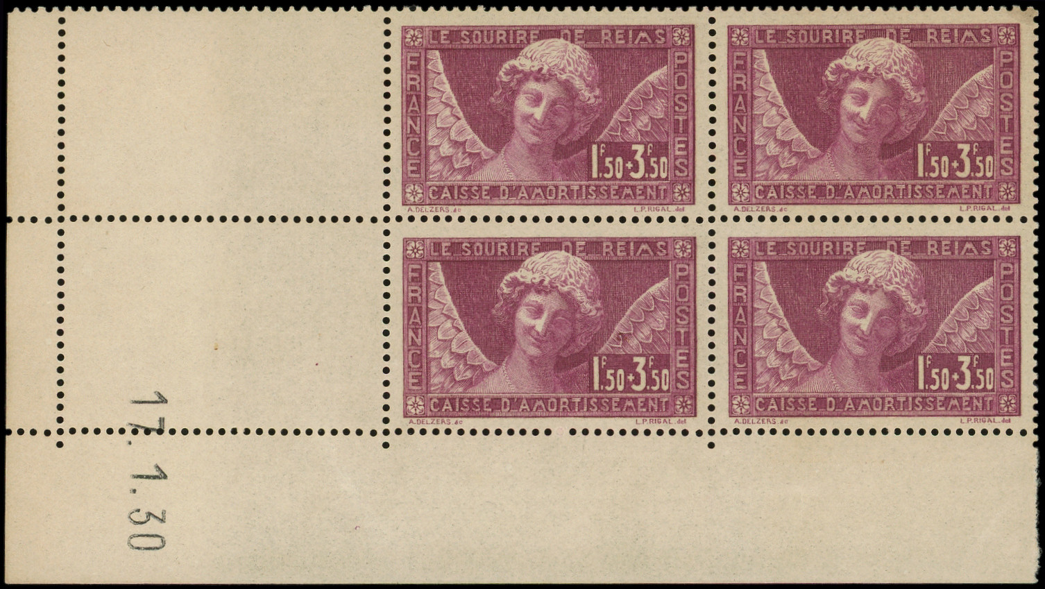 256 Sourire de Reims, 1f.50 + 3f.50 lilas, BLOC de 4 CD 17/1/30, TB