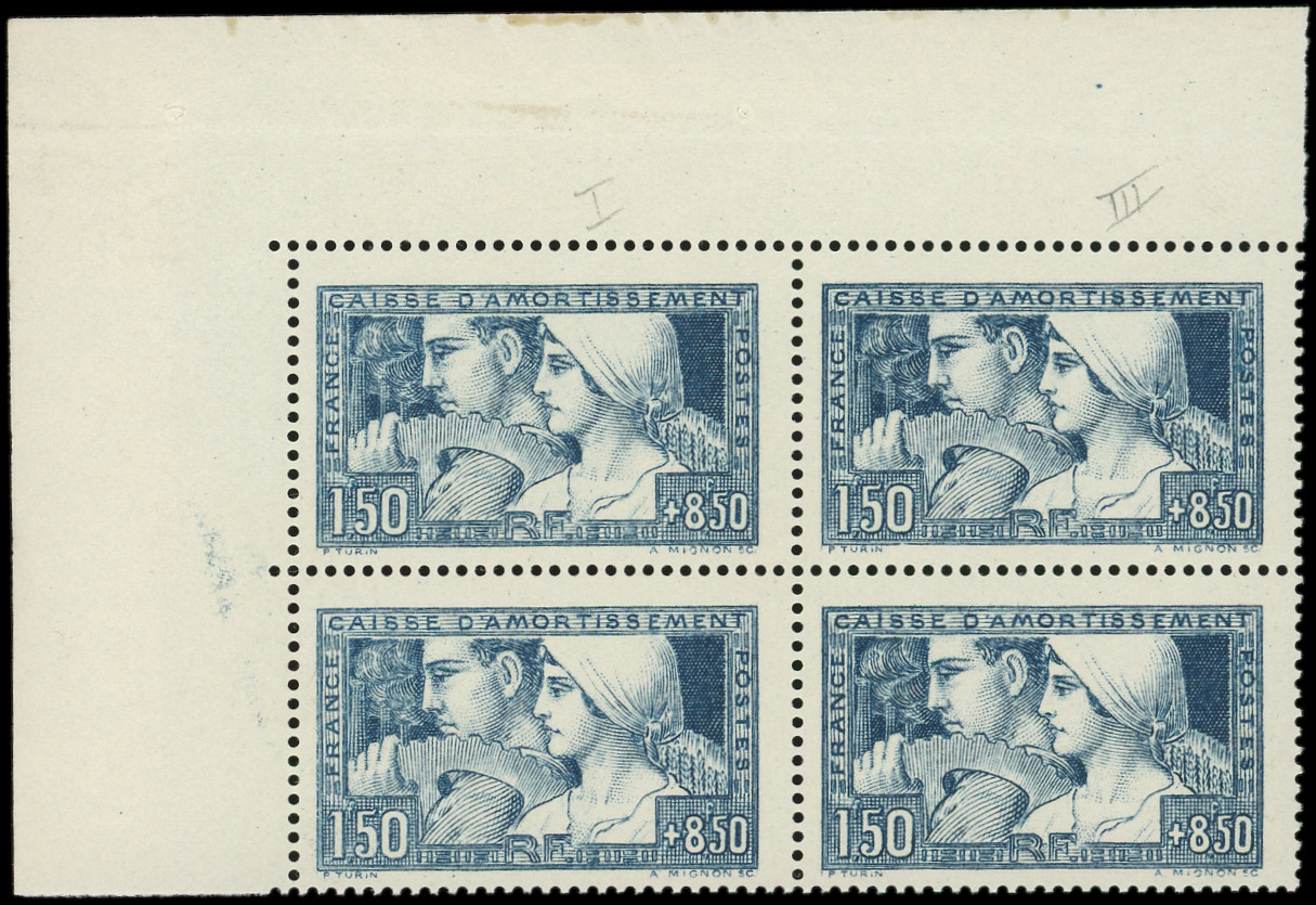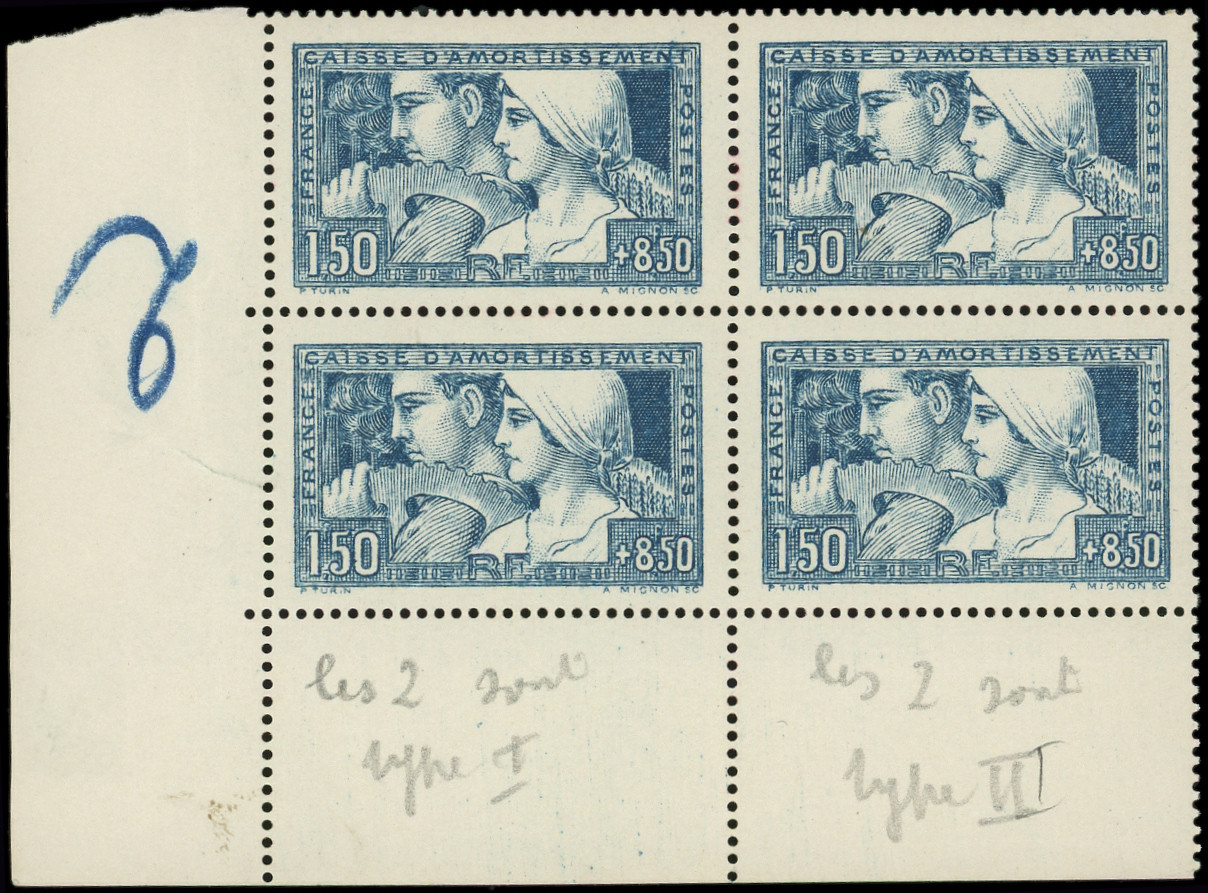252 Le Travail, 1f.50 + 8f.50, BLOC de 4 cdf, 2 ex. T I, 2 ex. T III, TB