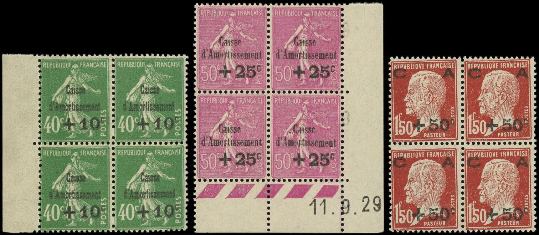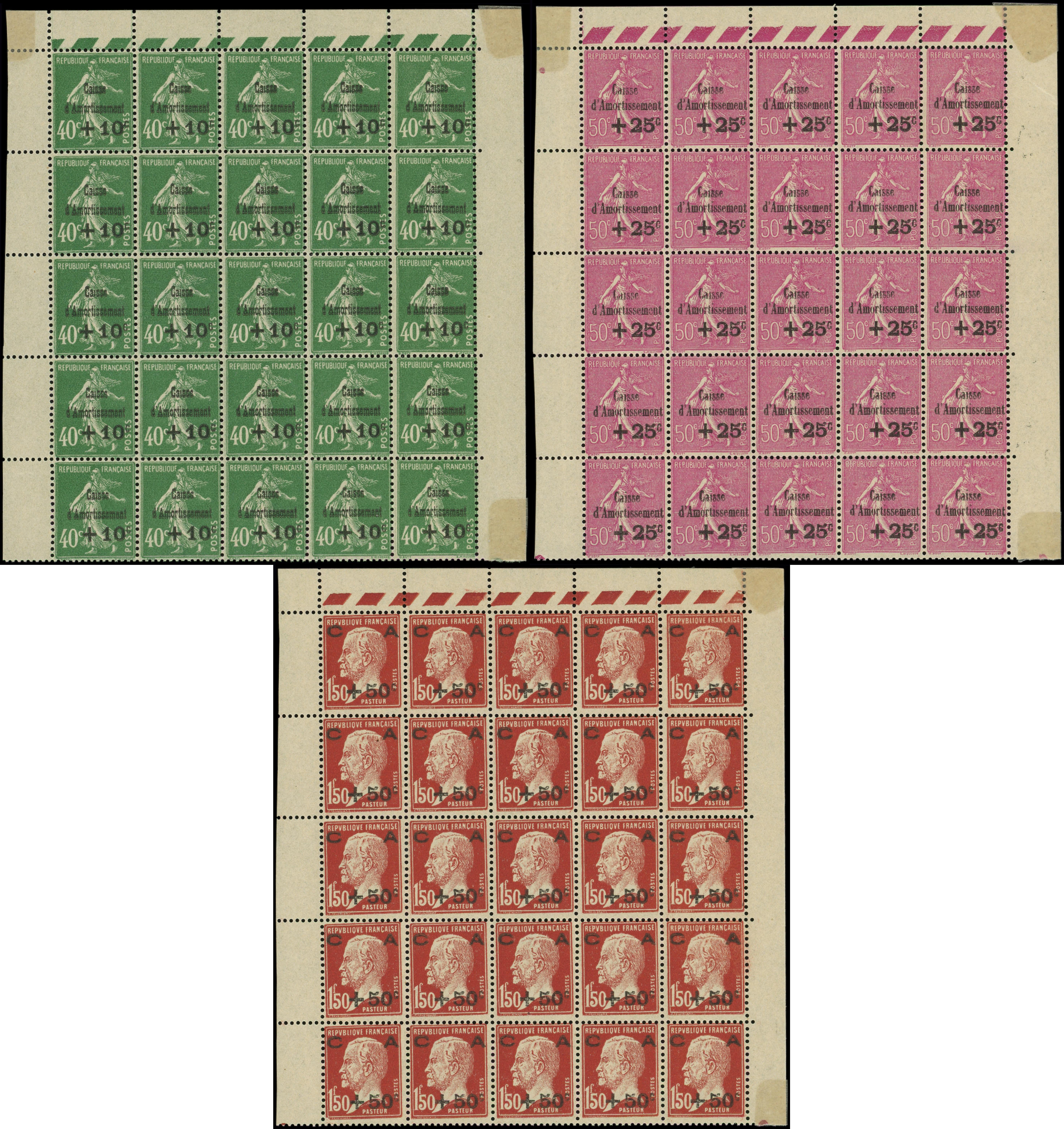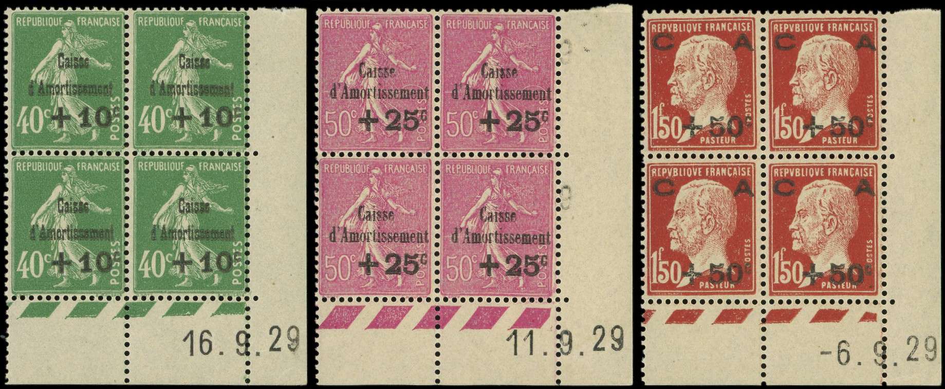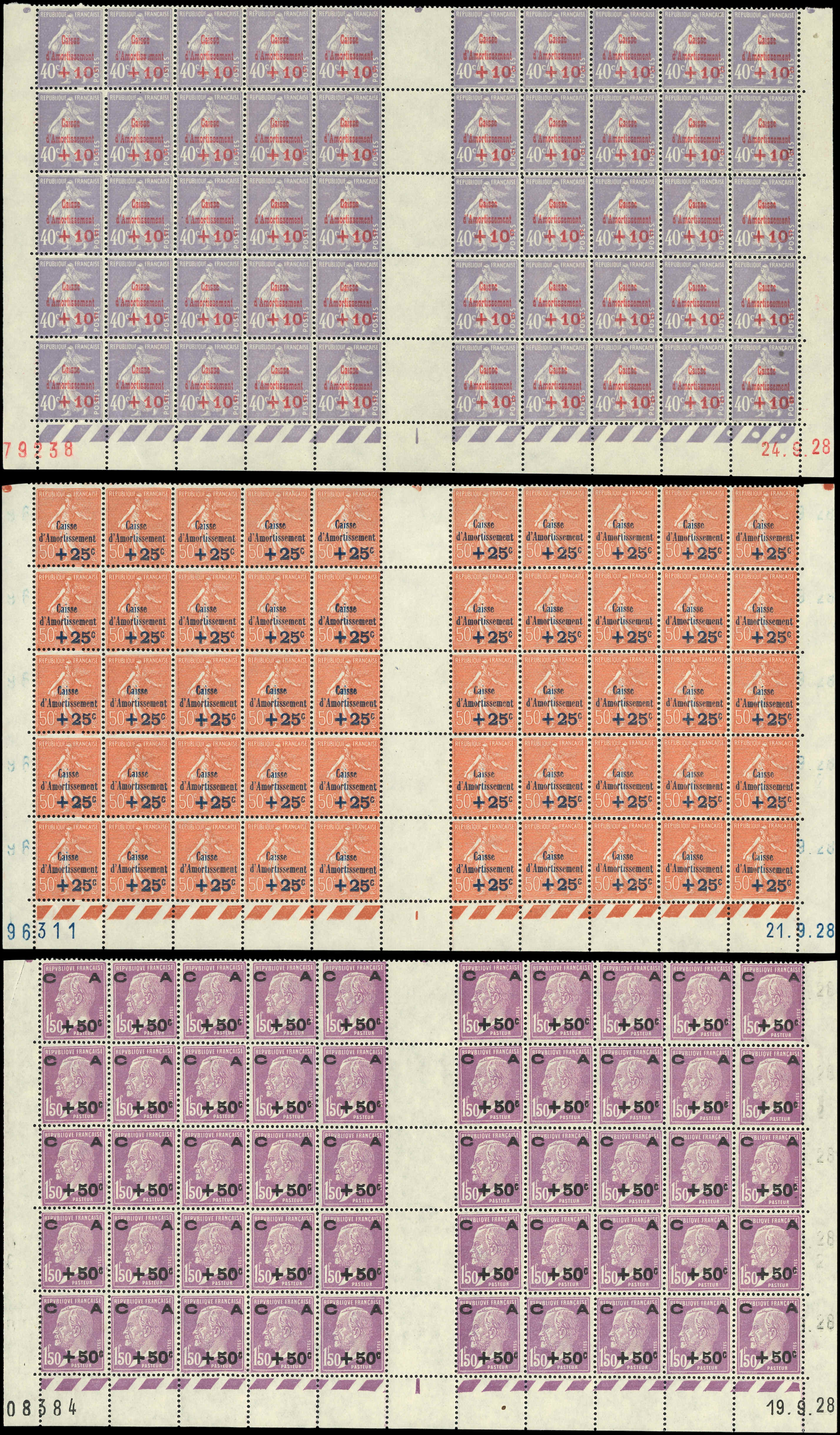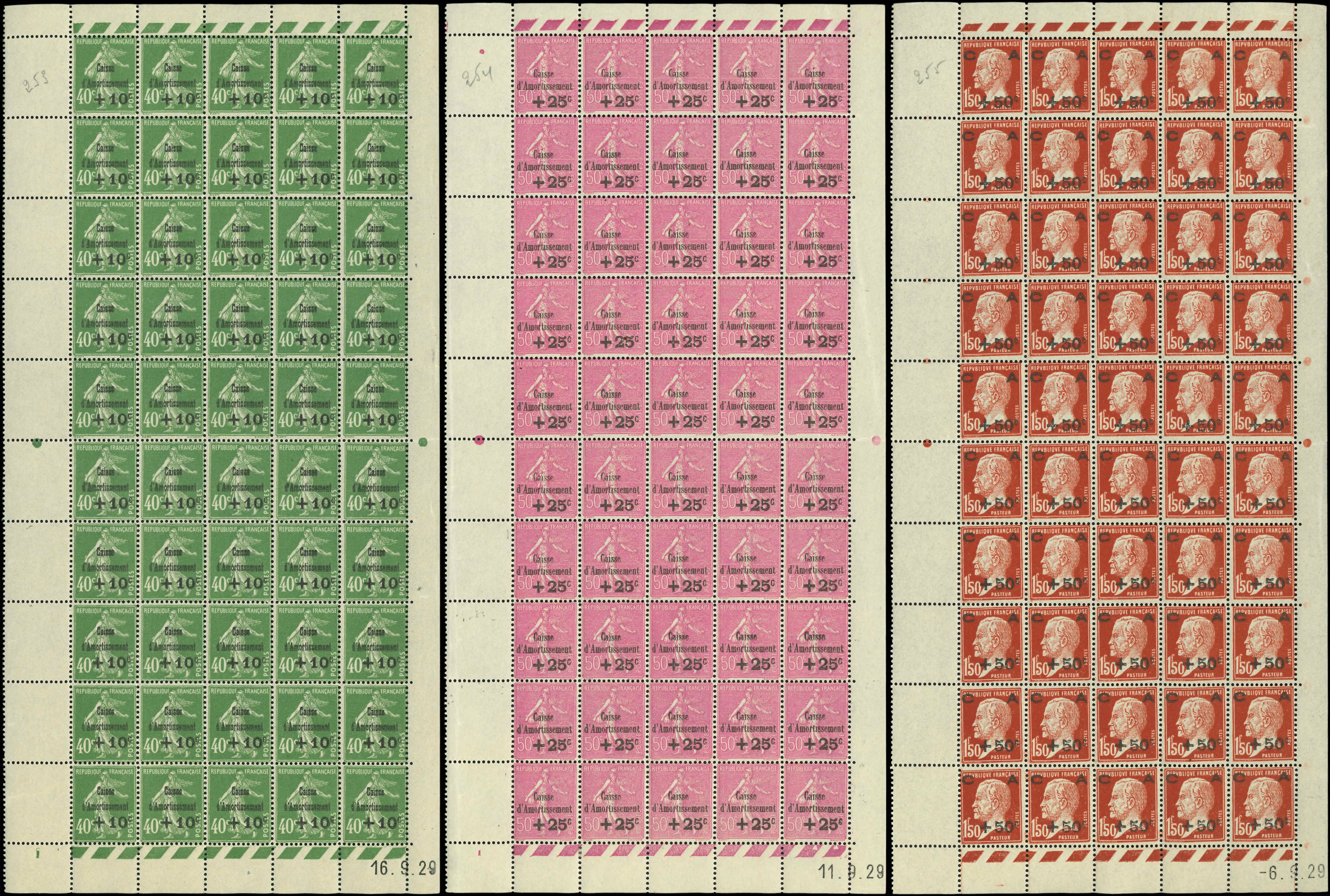 253/55 3ème série Amortissement, 3 PANNEAUX de 50, CD 16, 11 et 6/9/29, bon centrage d'ensemble, TB