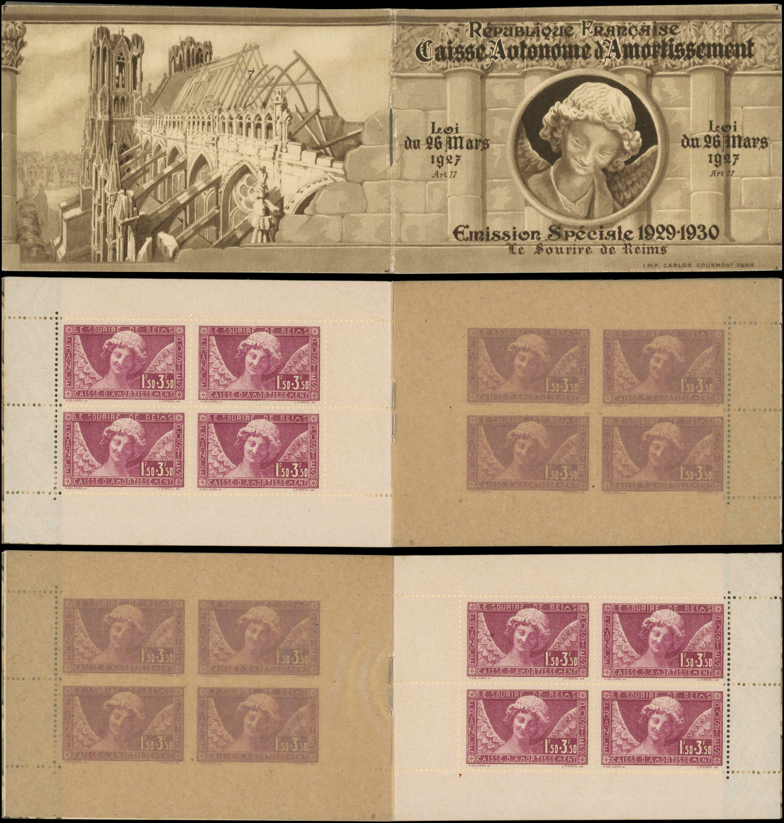 256 Sourire de Reims, 1f.50 + 3f.50 lilas, carnet de 8, TB