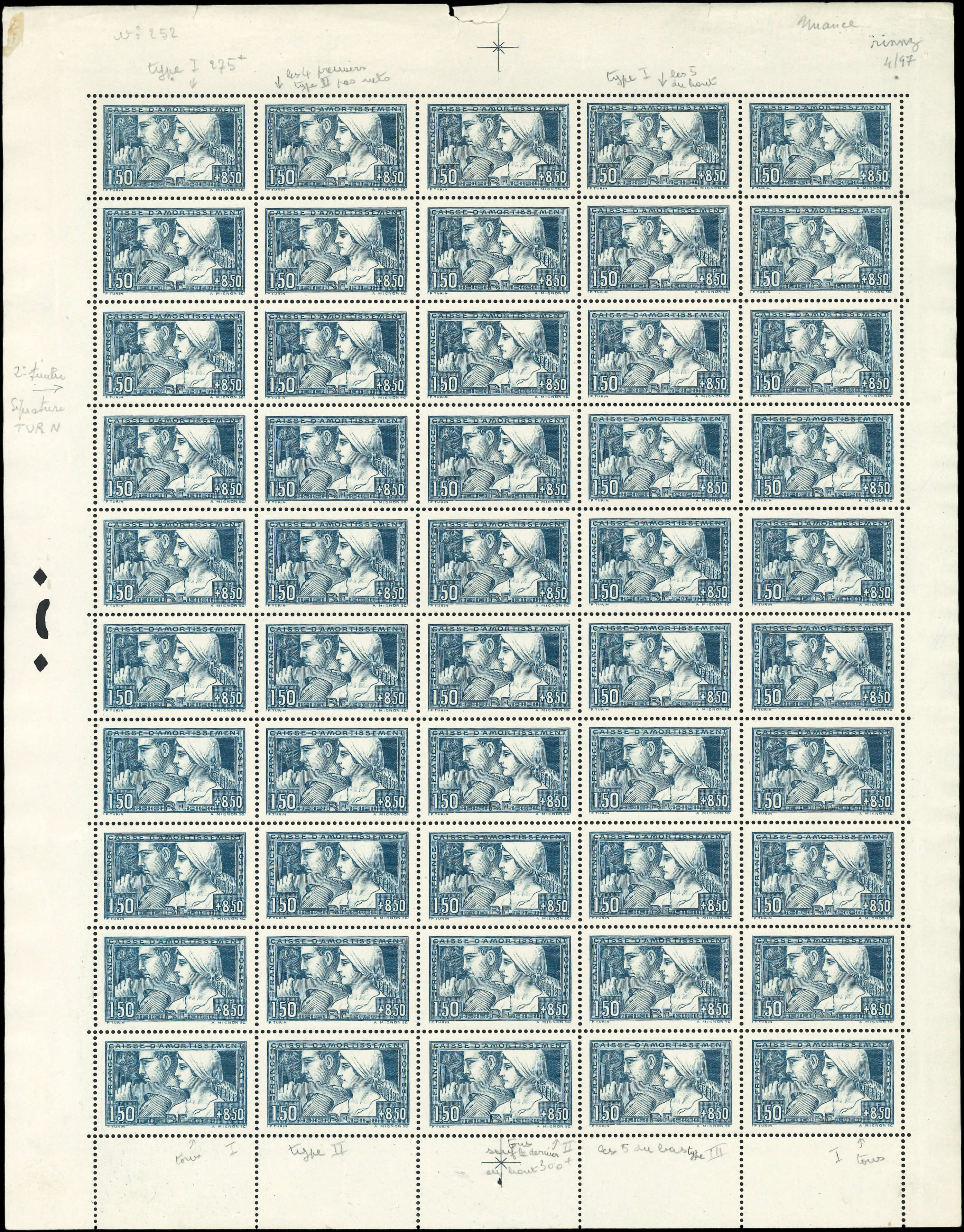 252 Le Travail, 1f.50 + 8f.50, FEUILLE de 50, RR ainsi, TTB