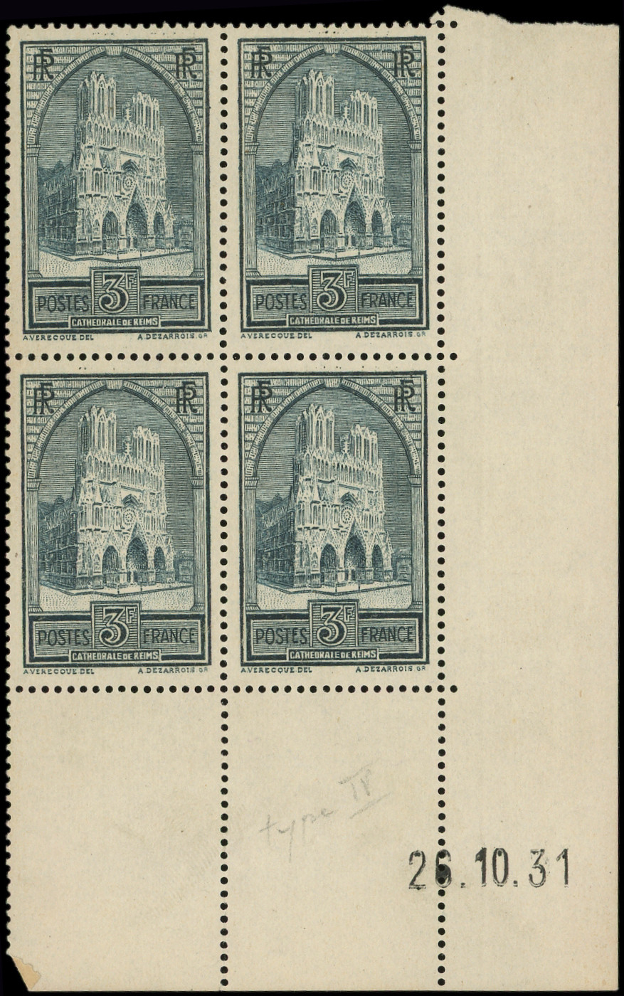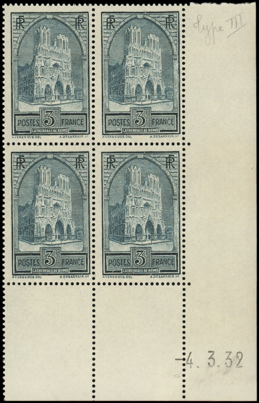 259c Cathédrale de Reims, 3f. ardoise, T IV, BLOC de 4 CD 4/3/32, ch. sur le bord, TB