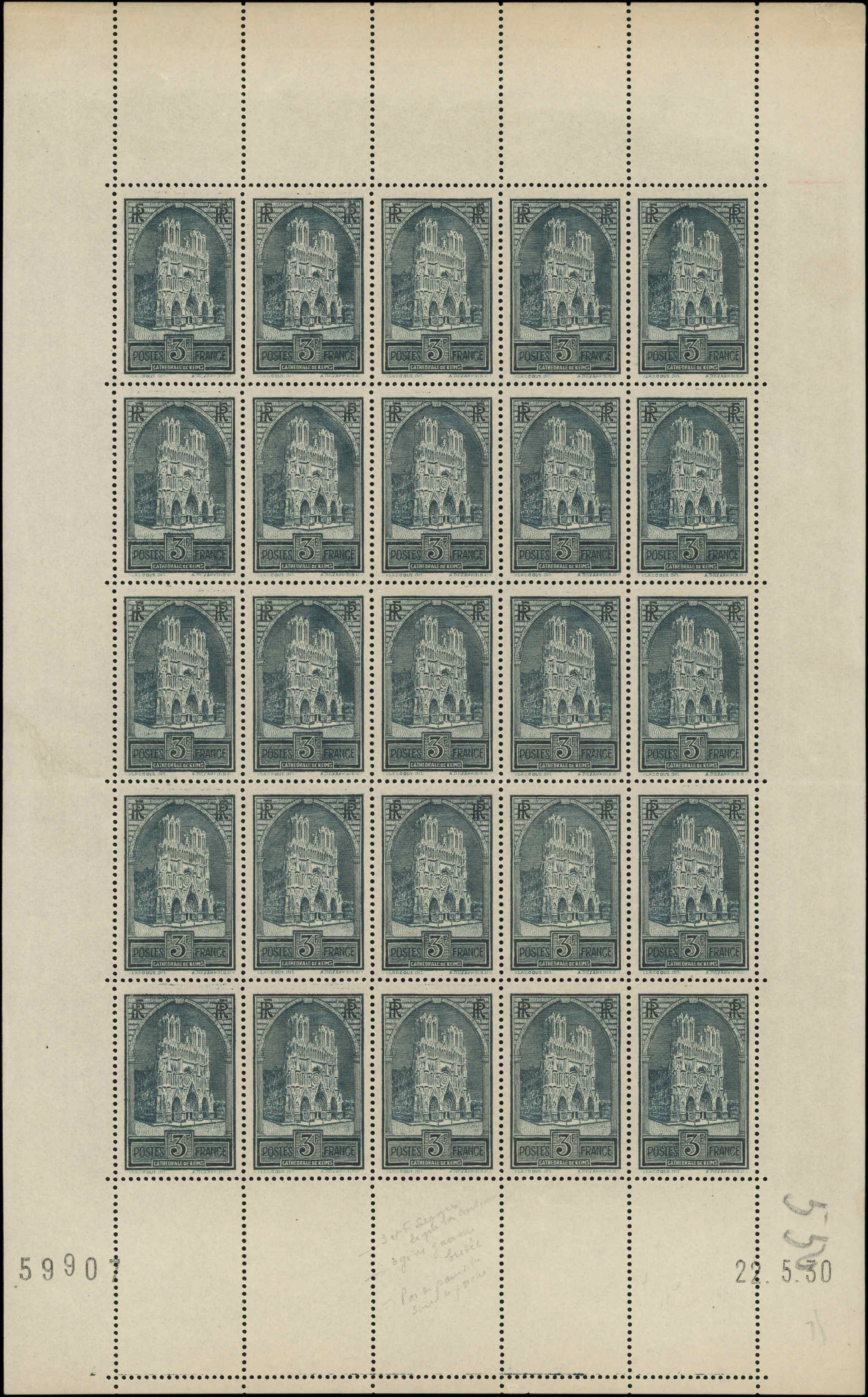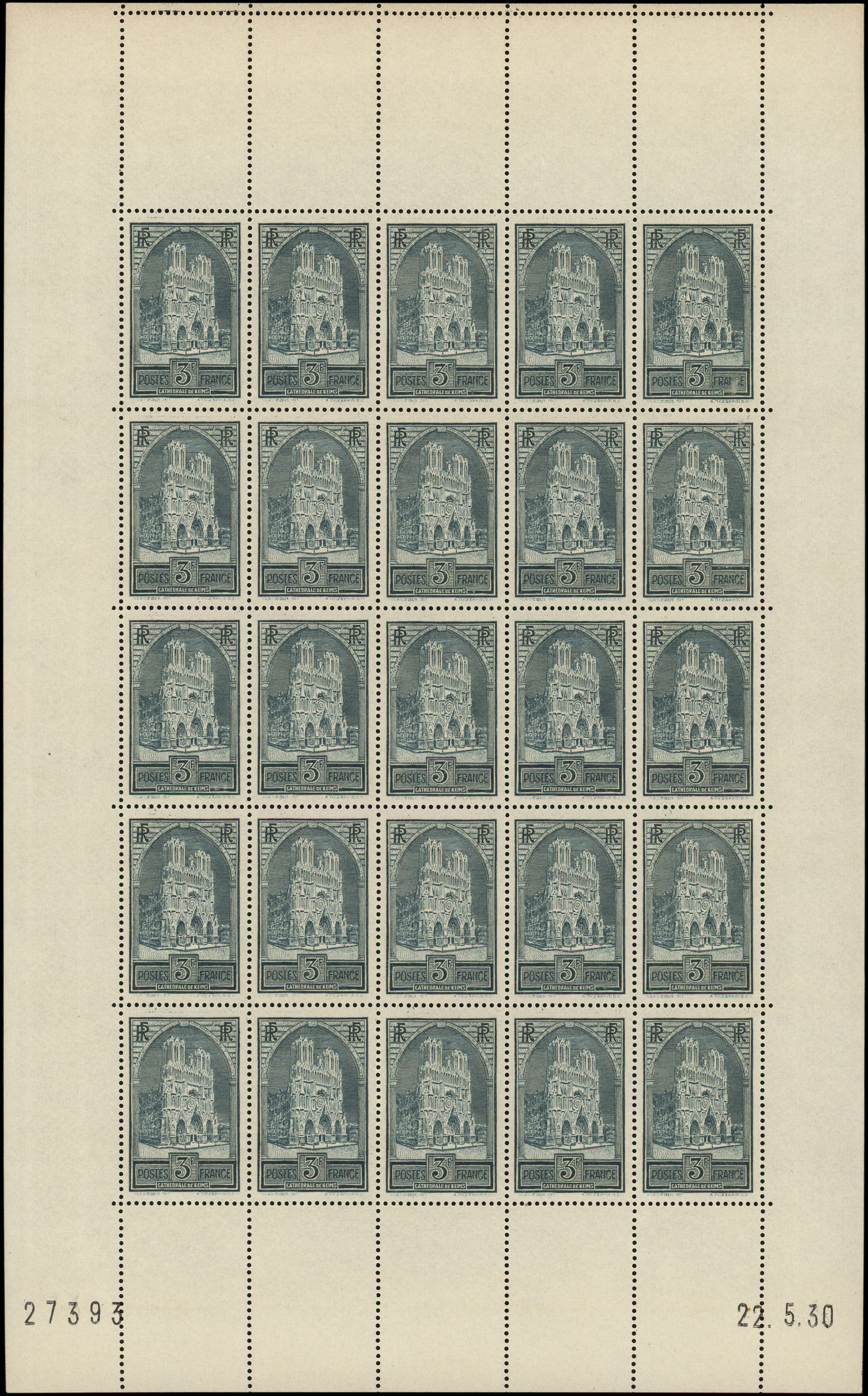 259a Cathédrale de Reims, 3f. ardoise, T II, FEUILLE de 25 CD 22/5/30, point noir s. 1 t. sinon TB