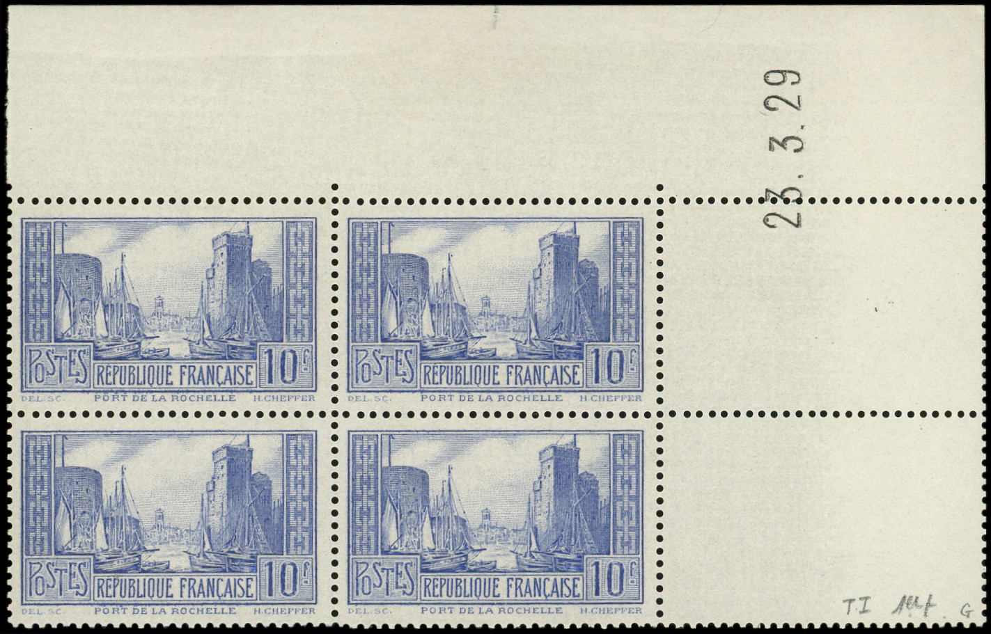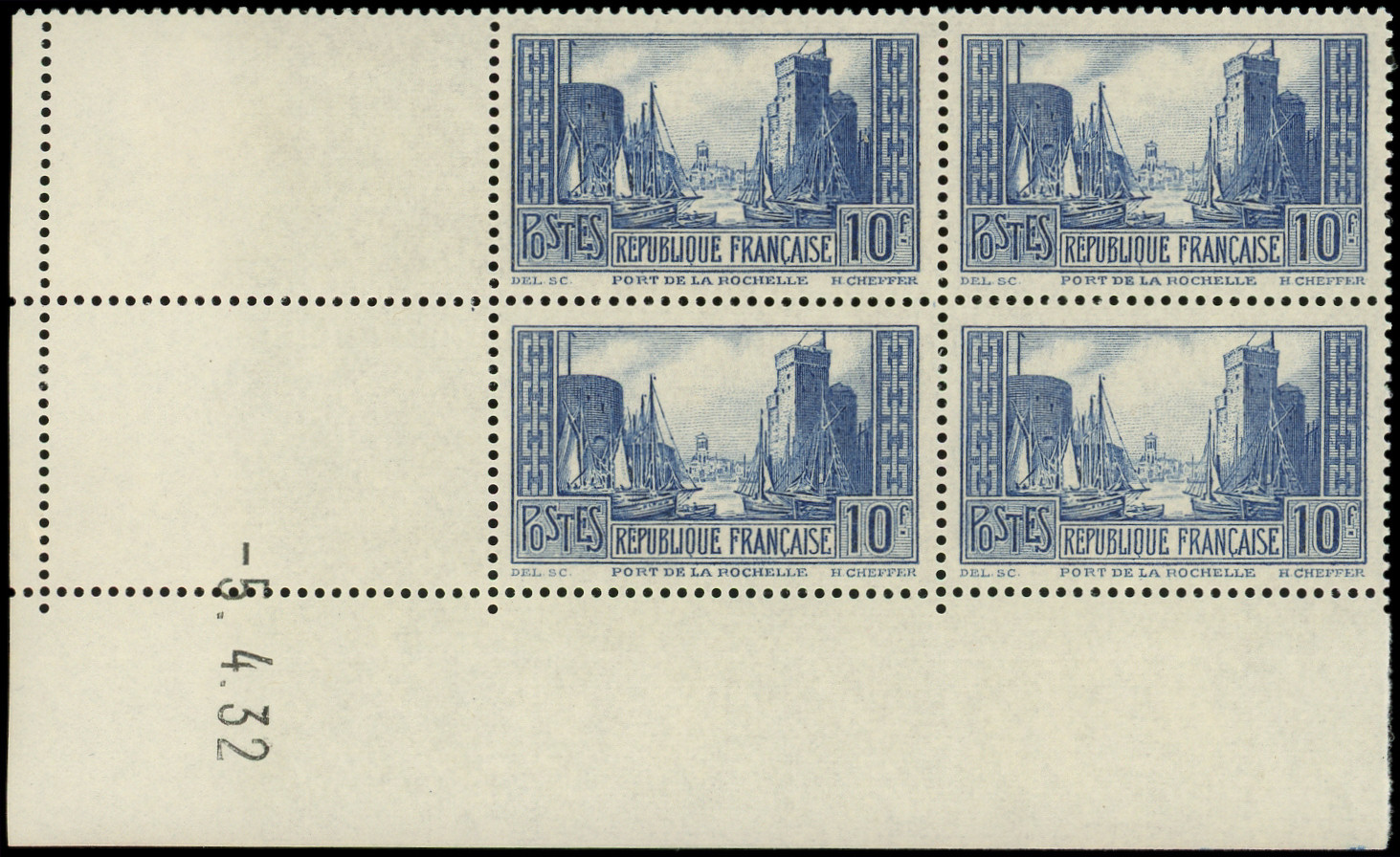 261 La Rochelle, 10f. bleu, T III, BLOC de 4 CD 5/4/32, ch. s. le bord, TB