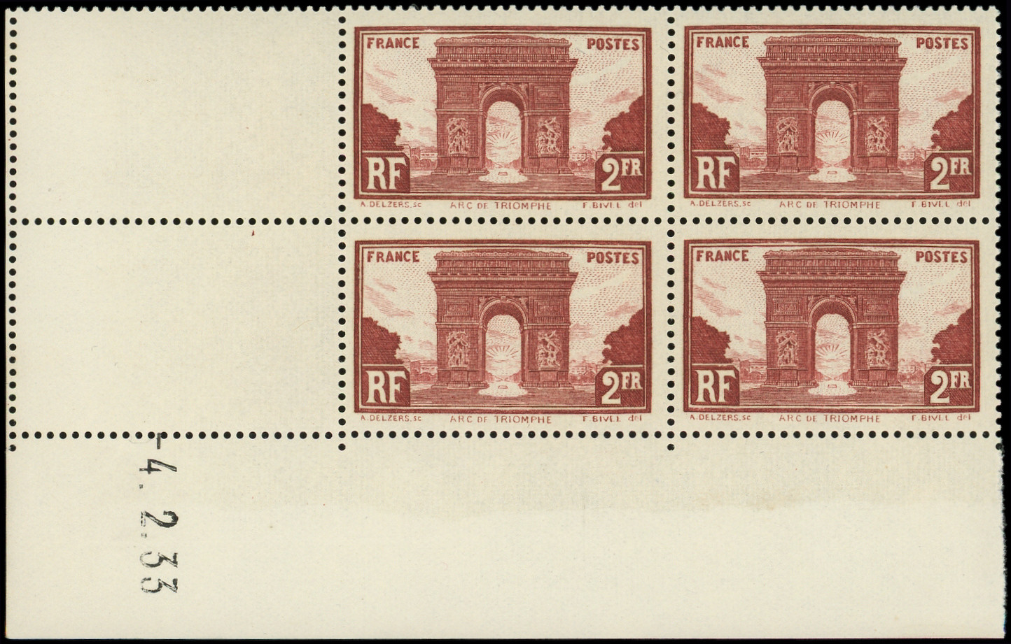 258 Arc de Triomphe, 2f. brun-rouge, BLOC de 4 CD 4/2/33, ch. s. un bord, TB